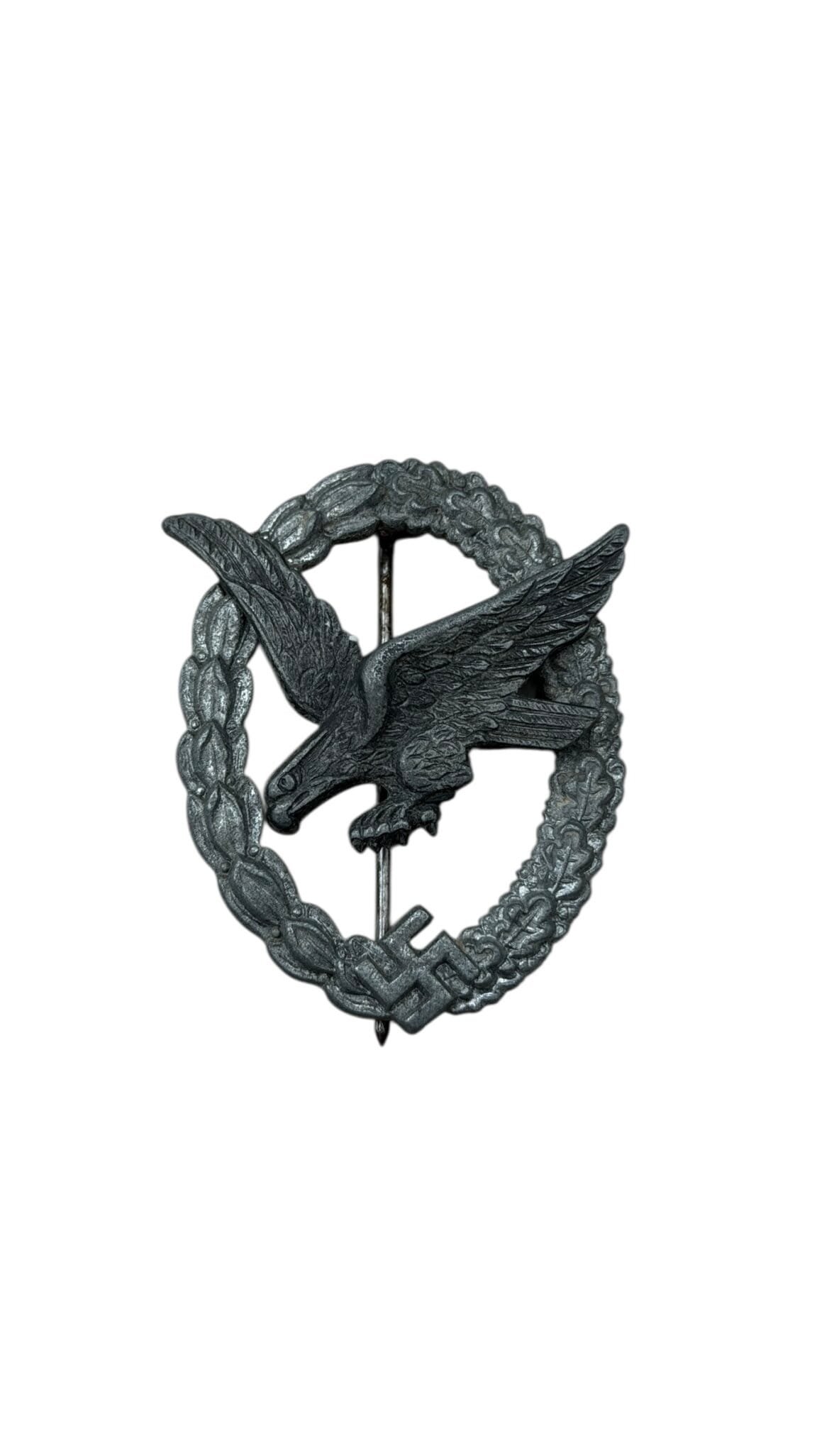 An originalWW2 German Luftwaffe Fliegerschützenabzeichen mit Blitzbündel (Radio Operator & Air Gunner Badge), manufactured byB&NL – Berg & Nolte, Lüdenscheid.This highly recognizable Luftwaffe award was bestowed upon radio operators and air gunners who completed operational requirements and demonstrated proficiency in aerial combat duties. The badge features the iconic design of adiving eagle clutching a lightning bundle (Blitzbündel), surrounded by an oak leaf wreath.This example displays the characteristic features associated withB&NL production, known for their quality and distinct detailing. The badge retains its original pin and catch assembly, and shows honest period wear, adding to its authenticity and appeal.