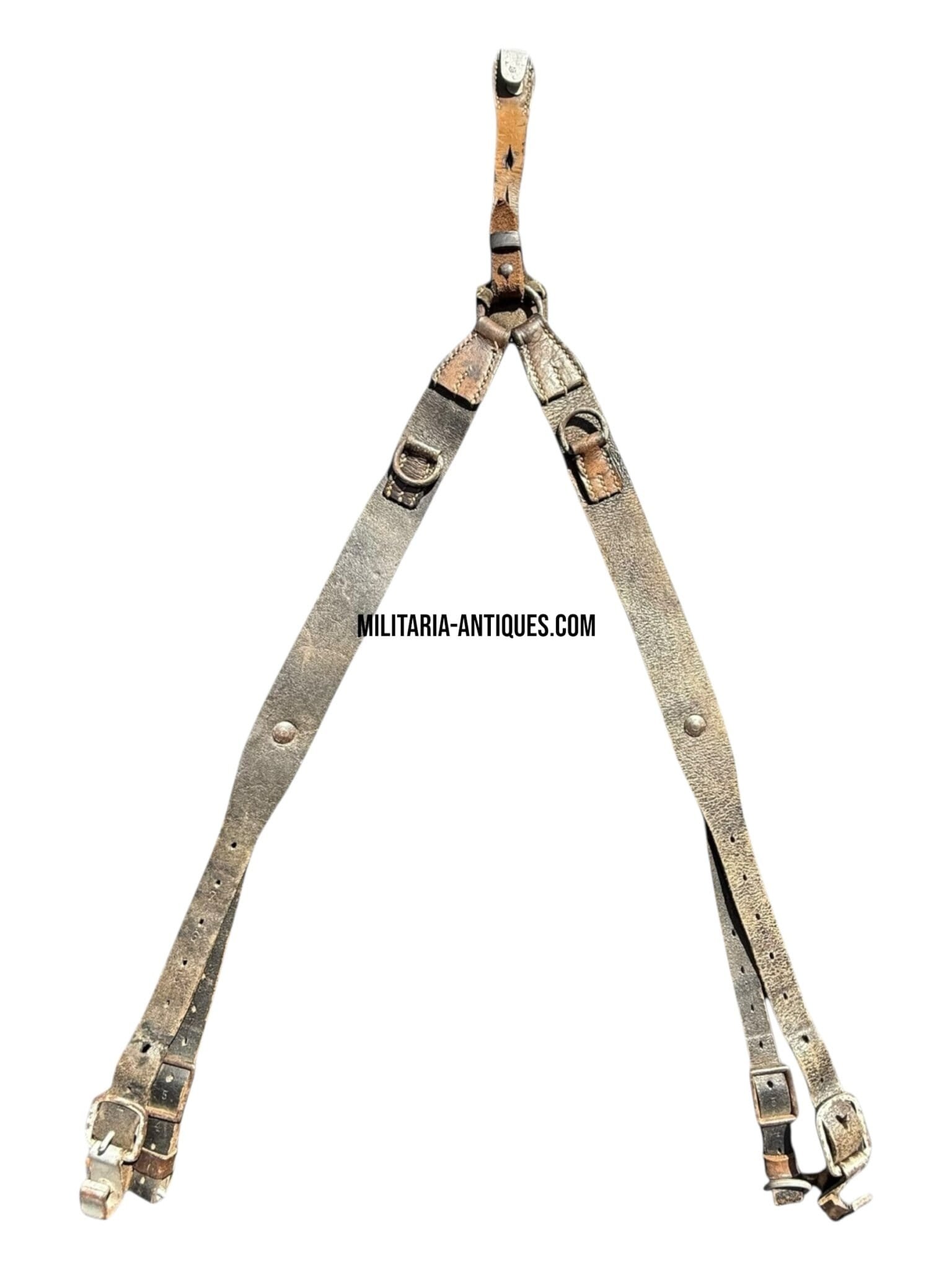 OriginalGerman Y-strap (Koppeltragegestell),double marked with RBNr and 1944 dateon the leather. This late-war example shows strong leather and intact hardware. One of the straps is a replacement taken from theAffe pack system, which explains the adjusted price. All stitching and rivets remain tight, and the leather is still supple. A nice, clearly marked late-war Y-strap with an interesting field modification, offering good value for collectors of WWII German field gear.