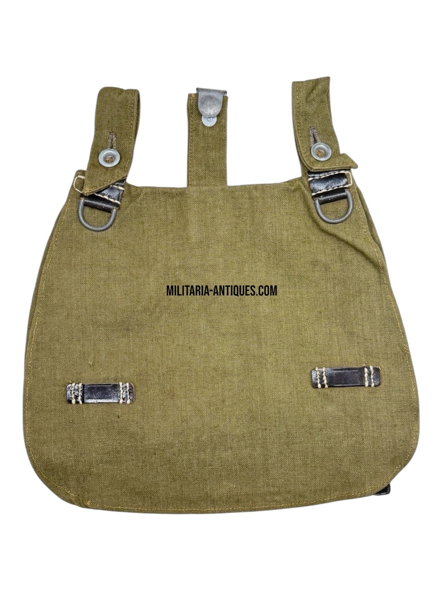 Originallate-war German breadbag (Brotbeutel)inmint condition, showing no signs of use. Constructed from simplified late-war fabric and steel hardware, this example isunmarked, as often seen with wartime economy production. All straps, buttons, and D-rings are intact, with stitching tight and strong throughout. A perfect representative piece of late-war German field gear, virtually impossible to upgrade.