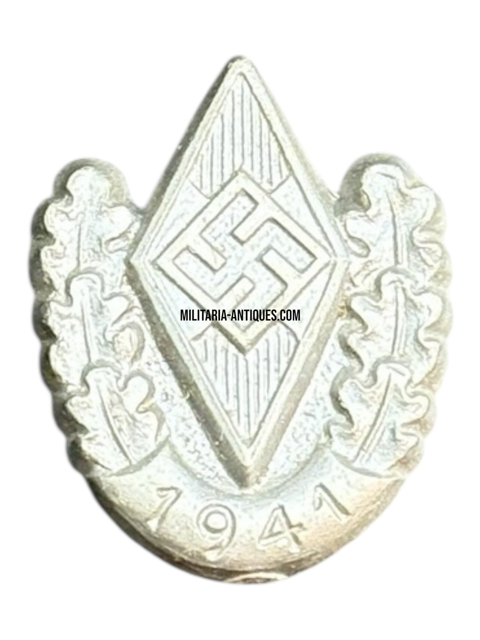 OriginalHitler Youth (Hitlerjugend) tinnie, dated1941. Made from stamped metal with its original pin on the reverse, this event badge was issued during youth rallies and gatherings organized by the HJ. The obverse displays the typical Hitler Youth diamond emblem and date, with clear detail and only minor age-related wear. A fine and affordable collectible, representing the youth movement of the Third Reich.