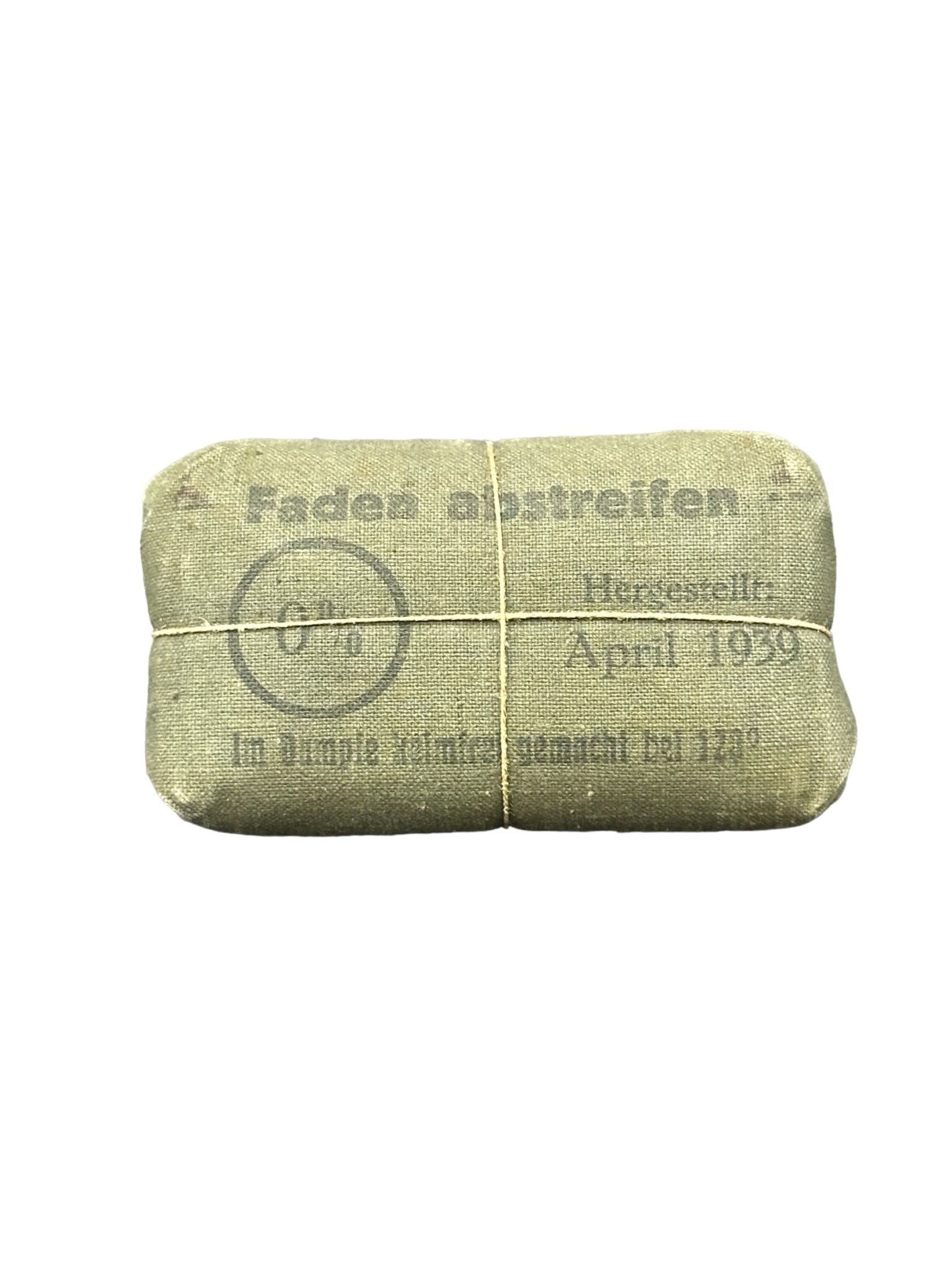 small type German first aid bandage, these were used in the uniform along with a large first aid kit, also perfect for completing your medical kit or for diaroma. dated 1939