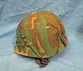 Original era manufacture. Grenada era helmet complete with a woodland pattern camouflage cover. The liner is complete with its canvas and leather adjustable sweatband. Old Army/Navy store price of $9.95 written inside the liner. I removed the liner and pulled the cover up, the steel pot has a front seam, non-reflective edge so is WWII production. Gloss OD paint finish to the steel. Clean looking helmet.