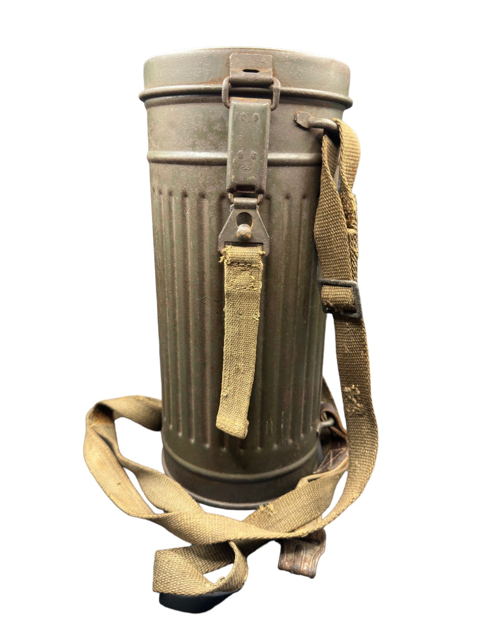 very nice gas mask canister with straps and marked ET, same maker as the knife kits and helmets. perfect to have these pieces together in a display.