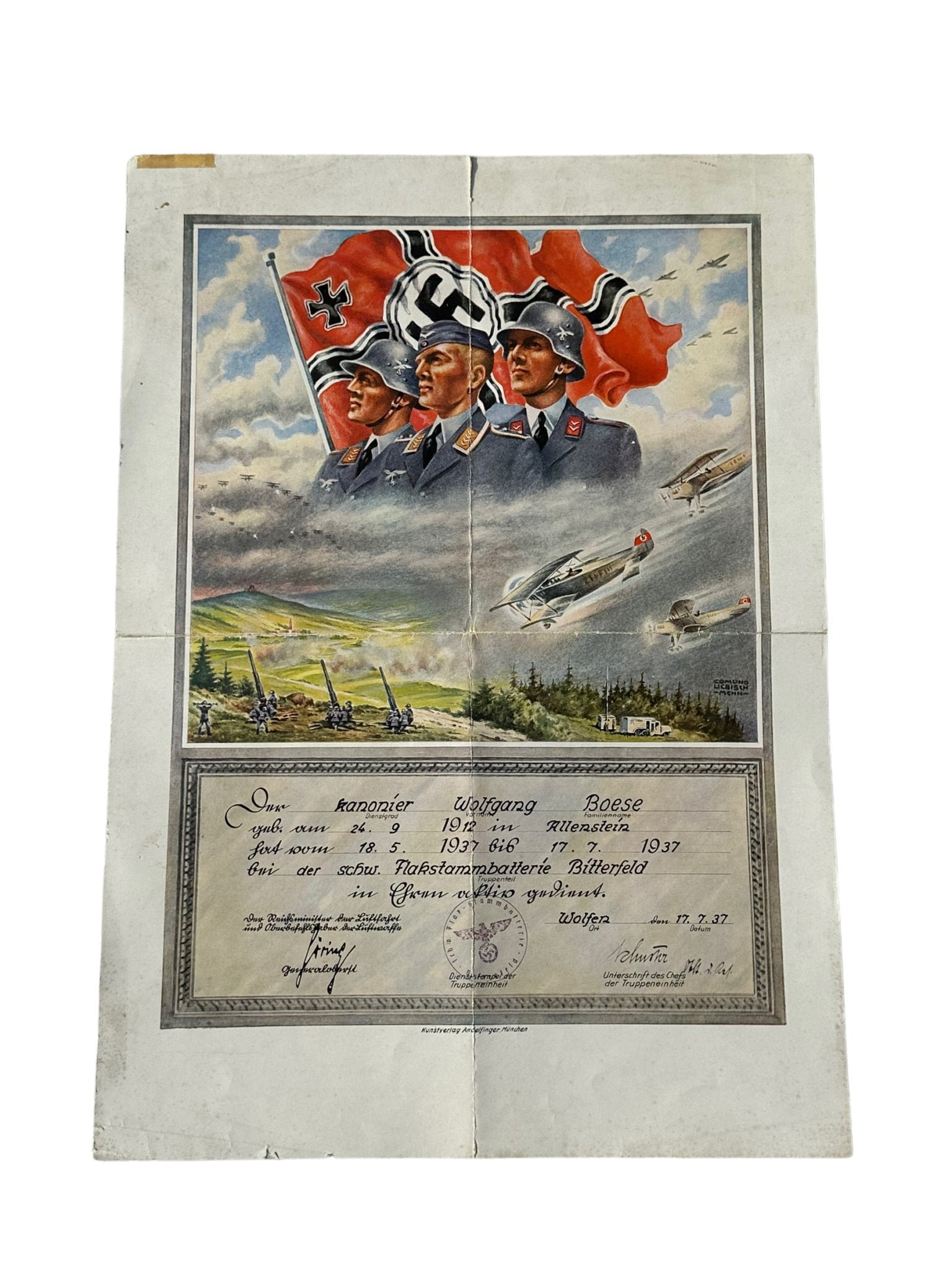 A finely crafted Luftwaffe certificate. This certificate adds a touch of authenticity to any collection, making it an ideal piece to complete your Luftwaffe memorabilia display. The intricate design and historical significance of this certificate make it a valuable addition for collectors