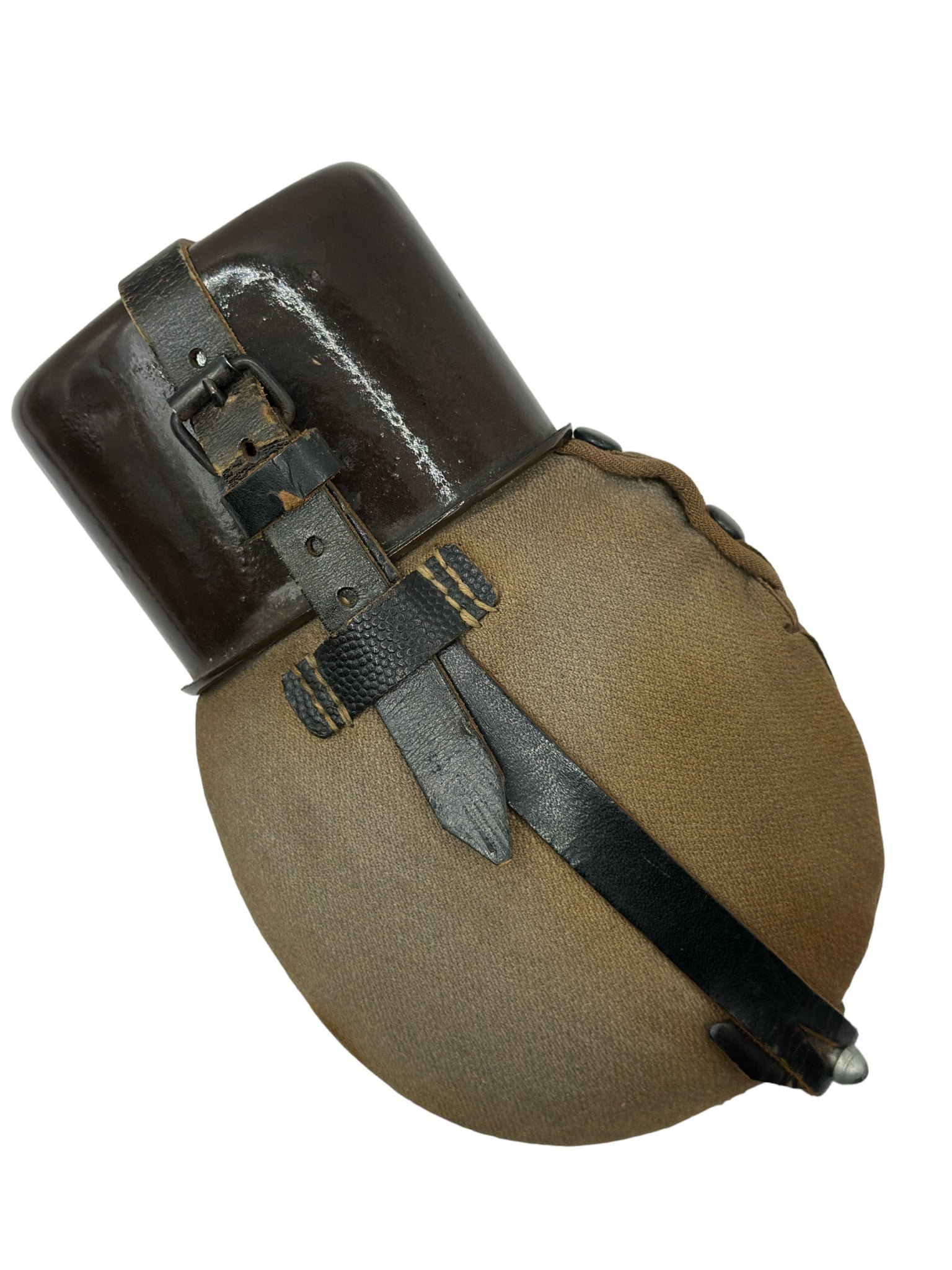 A unique AEMA canteen with its brown enamel canteen cup and black/blue bottle. Although in unused condition, it is unfortunately poorly preserved. Still, this top piece from our own collection will undoubtedly add a unique touch to yours, making it stand out among your collectibles.