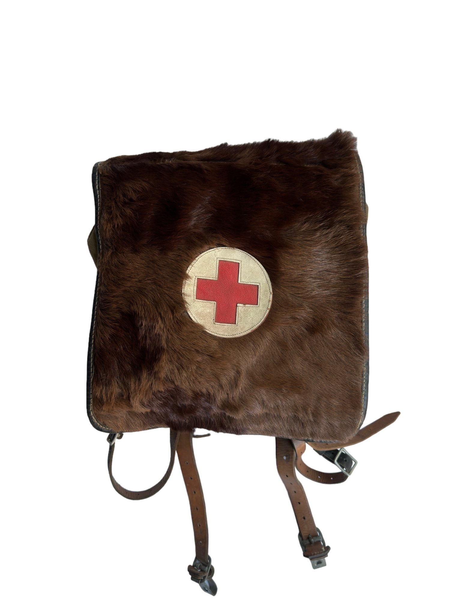 A very nice German combat medical backpack, featuring late-war construction with green canvas and black leather. The main flap has decent fur coverage, and the overall condition is excellent. Marked with the RBNr '0/0485/0002' and the date '1943,' this backpack is a rare find in such good shape.The carrying straps are maker marked and dated 'JOSEF WEIDINGER SÖHNE WIEN 1942.' The red cross is factory machine applied, adding to its authenticity. Don't miss the opportunity to acquire this hard-to-find German combat medical backpack in exceptional condition, a prized piece for collectors.