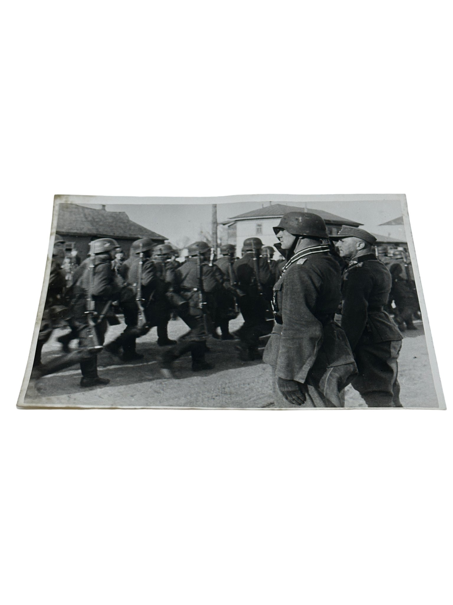 A very special photo with a Knight's Cross recipient, and upon closer inspection, reveals another soldier with the national shield decal still intact on his helmet. This unique image serves as a valuable piece of evidence that these decals were not always removed. A must-have for collectors and historians seeking nuanced insights into wartime practices.