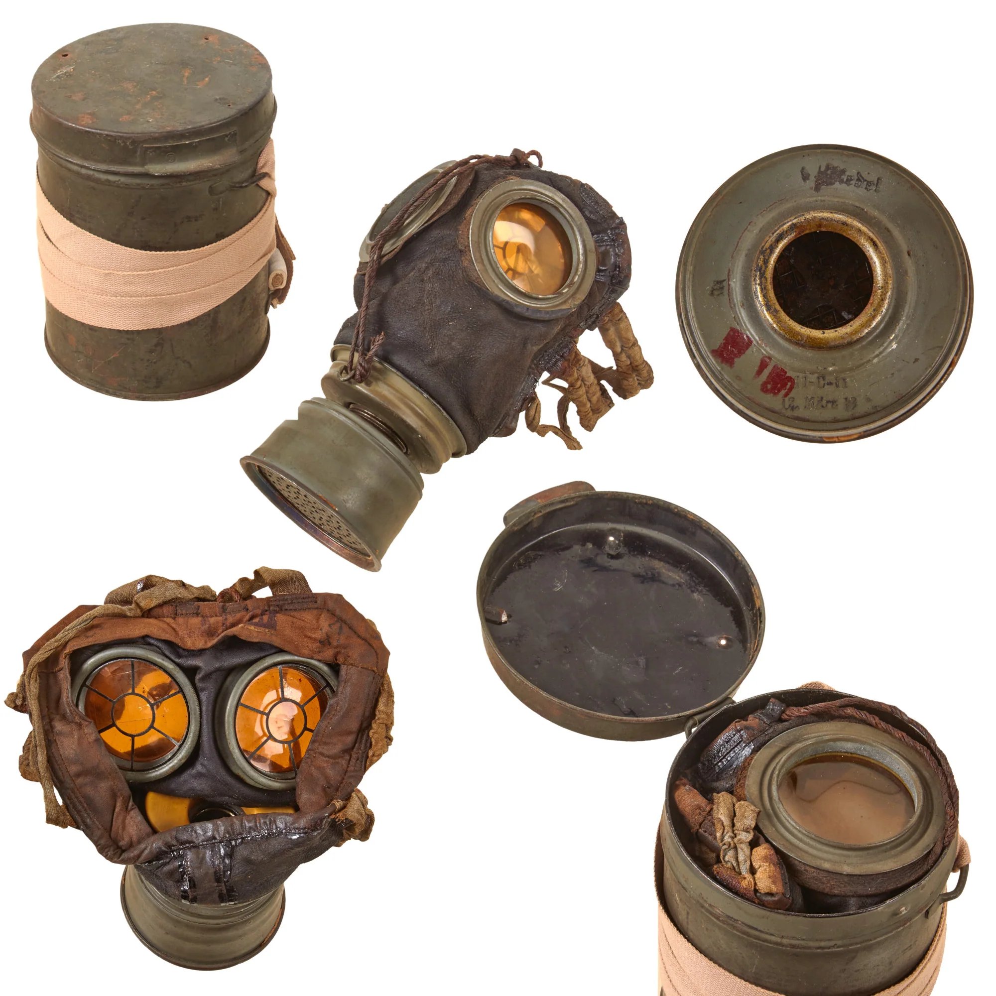 Item DescriptionOriginal Item: Only One Available. This is an excellent condition totally genuine World War One issue German gas mask. This model ofGasschutzmaske(Gas Protection Mask) was introduced in 1917, and was known as theLedermaskedue to its leather body construction. Canvas straps on the back of the mask were used to attach it to the wearer's head. The leather on this example is still soft, and the canvas rigging is in good shape but very worn. The mask retains all of its original straps including the scarce neck strap. The canister with this example is actually for the German GM-15Gummimaske, and has a replica carrying strap added.The metal eye guards are still intact and complete with original orange tinted lenses. The filter is nicely marked and ink stamped with12.Marz.18.Indicating manufacture onMarch 12th, 1918. There are also manufacture stamps and inspector markings. The mask of this example has a very interesting bone or ivory type mouthpiece, something we haven't seen before. Requires more research!The original Gummimaske canister is in good shape with three small holes in the lid from when the interior frame was removed so that it could hold a leather mask. They look to have been removed during the period. The canister has an added replica carrying strap which looks good.Overall a wonderful condition gas mask that was definitely field-used and is more than 100 years of age! Comes ready for display.Although the use of toxic chemicals as weapons dates back thousands of years, the first large scale use of chemical weapons was during World War I. They were primarily used to demoralize, injure, and kill entrenched defenders, against whom the indiscriminate and generally very slow-moving or static nature of gas clouds would be most effective. The types of weapons employed ranged from disabling chemicals, such as tear gas, to lethal agents like phosgene, chlorine, and mustard gas. This chemical warfare was a major component of the first global war and first total war of the 20th century. The killing capacity of gas was limited, with only about 90 thousand fatalities from a total of some 1.2 million casualties caused by gas attacks. Gas was unlike most other weapons of the period because it was possible to develop effective countermeasures, such as gas masks. In the later stages of the war, as the use of gas increased, its overall effectiveness diminished. The widespread use of these agents of chemical warfare, and wartime advances in the composition of high explosives, gave rise to an occasionally expressed view of World War I as 'the chemist's war' and also the era where 'weapons of mass destruction' were created.The use of poison gas performed by all major belligerents throughout World War I constituted war crimes as its use violated the 1899 Hague Declaration Concerning Asphyxiating Gases and the 1907 Hague Convention on Land Warfare, which prohibited the use of 'poison or poisoned weapons' in warfare.The most widely reported and, perhaps, the most effective gas of the First World War was mustard gas. It was a vesicant that was introduced by Germany in July 1917 prior to the Third Battle of Ypres. The Germans marked their shells yellow for mustard gas and green for chlorine and phosgene; hence they called the new gas Yellow Cross. It was known to the British as HS (Hun Stuff), while the French called it Yperite (named after Ypres).Mustard gas is not a particularly effective killing agent (though in high enough doses it is fatal) but can be used to harass and disable the enemy and pollute the battlefield. Delivered in artillery shells, mustard gas was heavier than air, and it settled to the ground as an oily liquid resembling sherry. Once in the soil, mustard gas remained active for several days, weeks, or even months, depending on the weather conditions.The skin of victims of mustard gas blistered, their eyes became very sore and they began to vomit. Mustard gas caused internal and external bleeding and attacked the bronchial tubes, stripping off the mucous membrane. This was extremely painful. Fatally injured victims sometimes took four or five weeks to die of mustard gas exposure.One nurse, Vera Brittain, wrote: 'I wish those people who talk about going on with this war whatever it costs could see the soldiers suffering from mustard gas poisoning. Great mustard-coloured blisters, blind eyes, all sticky and stuck together, always fighting for breath, with voices a mere whisper, saying that their throats are closing and they know they will choke.'The polluting nature of mustard gas meant that it was not always suitable for supporting an attack as the assaulting infantry would be exposed to the gas when they advanced. When Germany launched Operation Michael on 21 March 1918, they saturated the Flesquières salient with mustard gas instead of attacking it directly, believing that the harassing effect of the gas, coupled with threats to the salient's flanks, would make the British position untenable.Gas never reproduced the dramatic success of 22 April 1915; however, it became a standard weapon which, combined with conventional artillery, was used to support most attacks in the later stages of the war. Gas was employed primarily on the Western Front: the static, confined trench system was ideal for achieving an effective contingent. Germany also made use of gas against Russia on the Eastern Front, where the lack of effective countermeasures resulted in deaths of over 56,000 Russians, while Britain experimented with gas in Palestine during the Second Battle of Gaza. Russia began manufacturing chlorine gas in 1916, with phosgene being produced later in the year. However, most of the manufactured gas was never used.The British Army believed that the use of gas was needed, but did not use mustard gas until November 1917 at Cambrai, after their armies had captured a stockpile of German mustard-gas shells. It took the British more than a year to develop their own mustard gas weapon,