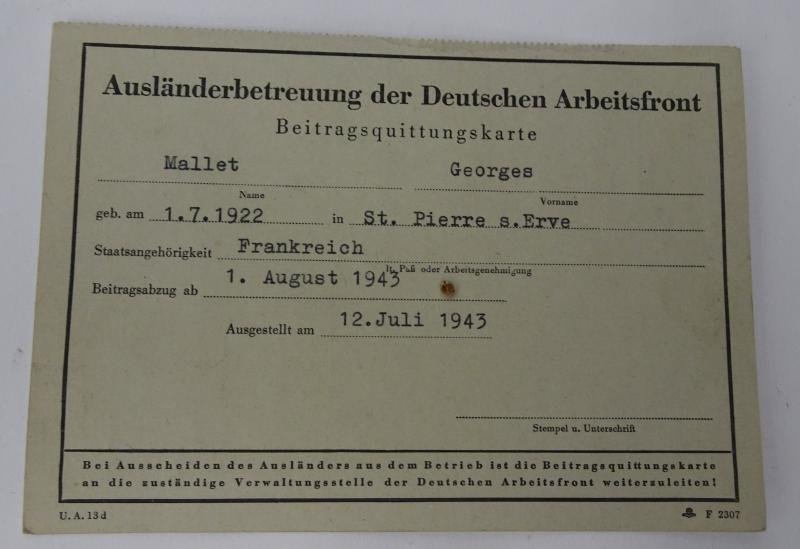 in a very nice used condition a foreign deutse arbeitsfront support card he is on the name of'Georges mallet ' a Frenchman from st .pierre s.erve dated july 12, 1944