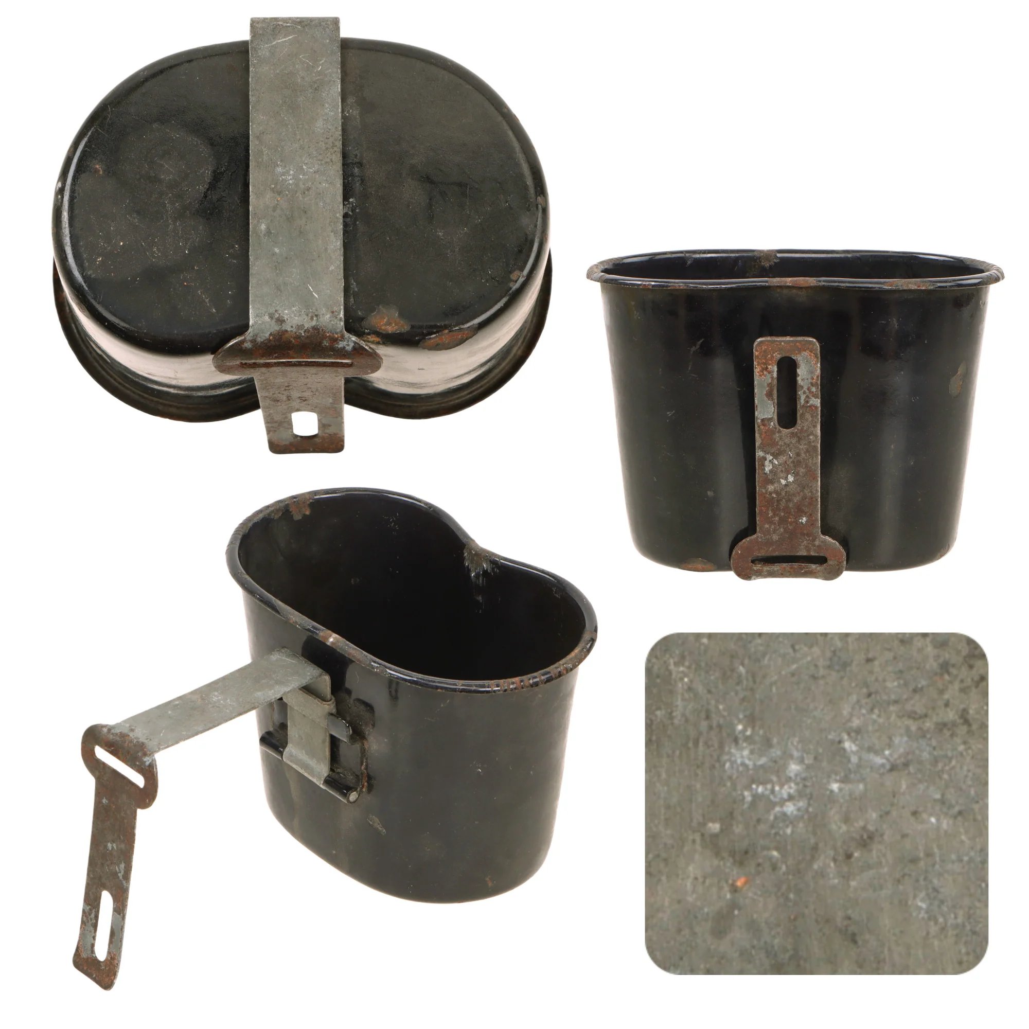 Item DescriptionOriginal Item: Only One Available. Early in World War II, aluminum was urgently needed for aircraft. Therefore, in 1942 stainless steel canteens were substituted for aluminum and alternative materials were investigated, such as plastic for canteens. Another idea for conserving the most valuable metals was to use a lower quality metal with a porcelain enameled coating.The result was this, the M1942 Porcelain Enamel Canteen. Unfortunately, this 'experiment' was not successful at all, and there were numerous complaints from the field, as the chipped enamel inside from a dent would result in water contamination, and overall the canteens were just not very resilient. They were quickly removed from service, and replaced by the standard aluminum canteens that everyone is familiar with today. They are very scarce on the market.This cup is in fair condition but has some heavy oxidation on the rim and the handle as shown, and some moderate chips in the porcelain enamel. The folding handle is very heavily oxidized but it is faintly marked withU.S. / L.F.&C. / 1942.Overall this is a good canteen cup with rare blue enamel, ready to add to your collection and display!Shipping RestrictionsThis product is available for international shipping.Payment OptionsEligible for all payments - Visa, Mastercard, Discover, AMEX, Paypal & Sezzle