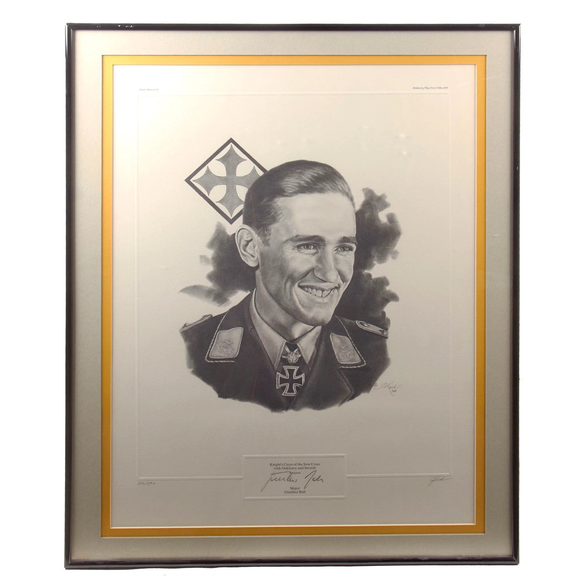 Item DescriptionOriginal Item. One-of-a-Kind. Günther Rall was a highly decorated German military aviator, officer and General, whose military career spanned nearly forty years. Rall was the third most successful fighter pilot in aviation history, behind Gerhard Barkhorn, who is second, and Erich Hartmann, who is first. Rall was assigned to Jagdgeschwader 52 (JG 52—52nd Fighter Wing) and flew combat patrols during the Phoney War period on the Western Front. Rall flew combat missions in the Battle of France and Battle of Britain, claiming one enemy aircraft destroyed in May 1940. During World War II, Rall was credited with the destruction of 275 enemy aircraft in 621 combat missions. He was shot down five times and wounded on three occasions.This is a great framed print of a drawing of Günther Rall by J.G. Keck, depicting Galland in wartime uniform, signed by Galland at the right in pencil. The print is also signed in pencil by the artist with the limitation '310/500'.This print was published by King's Crown Gallery over 12 years ago and has long since sold out. They were 80 percent sold out in 1989 and now, 37 years later, they are rare to find. The frame measures22 ¼ x 28 ¼'and is in great shape overall with acrylic as opposed to glass.A great framed print of one of the greatest fighter aces of all time, ready for further research and display.Shipping RestrictionsThis product is available for international shipping.Shipping not available to: Australia, France, or GermanyPayment OptionsNot eligible for payment with Paypal or AmazonLegal InformationDue to legal restrictions this item cannot be shipped to Australia, France or Germany. This is not a comprehensive list and other countries may be added in the future.