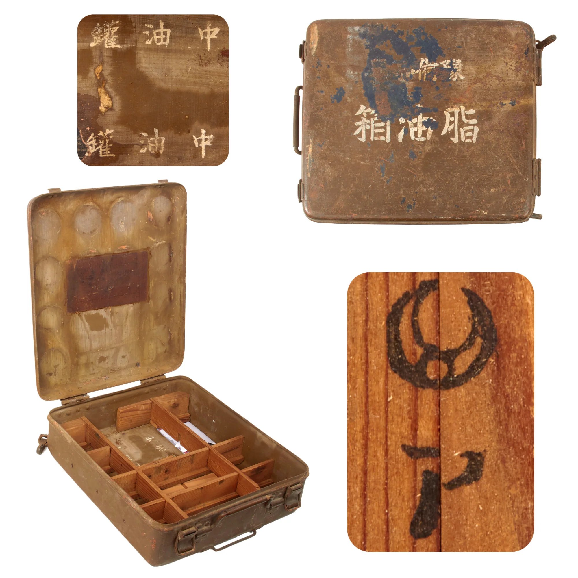 Item DescriptionOriginal Item. Only One Available. This is a scarce Imperial Japanese metal crate for the storage and transportation of Automatic Transmission Fluid Oil cans, none of which are still present. The three visible letters on the lid appear to read箱油脂which brings up ATF or Automati Transmission Fluid. And on the interior are six symbols in a large space which translate to'Canned oil, medium'.The crate when closed measures 13 ½ x 15 ¾ x 4 ¾' and is in good condition without any serious oxidation. The box has two retained hooks at two corners which were certainly for attachment to a tank or vehicle. Weights about 12.5lbs empty.Both latches are in good functional condition but there is heavy wear to the exterior of the case. The interior lid has a label which has been entirely blacked out. The dividers are in good shape but have damage.Ready for display.Shipping RestrictionsThis product is available for international shipping.Payment OptionsEligible for all payments - Visa, Mastercard, Discover, AMEX, Paypal & Sezzle