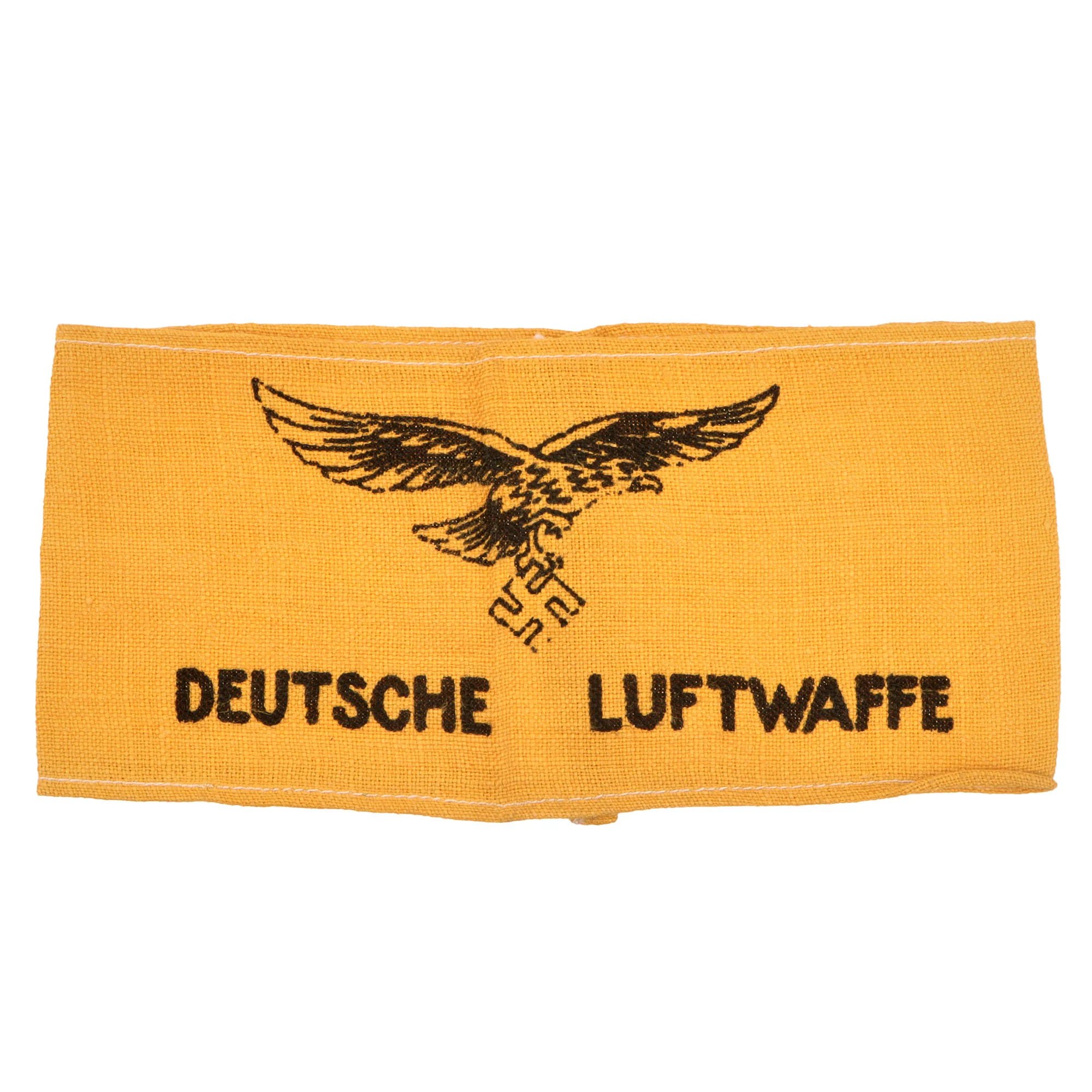 Item DescriptionOriginal Item: Only One Available. This is an original example of a very desirable Deutsche LuftwaffeÄrmelbinde(Armband). This pattern of armband was issued to air crew for use if they had to bail out of an aircraft, to identify them to German units (or hopefully friendly civilians or police) on the ground. The armband is made from yellow cotton fabric, with the edges are finished with white machine stitching, and is factory sewn together in the back, as these were issued.Condition of the armband is unissued, with just the slightest bit of age toning and wear. It has the correct Luftwaffe Eagle overDEUTSCHE LUFTWAFFEstamped / printed onto the side of the armband. On the inside, the black ink has soaked through the fabric and is visible in reverse, a typical trait of period printing. Measures approximately 15 x 3 1/2 inches, and is sewn together in the back with a French seam.An excellent unissued example of a rare armband, ready to display as part of a pilot or aircrew collection!Nearly every military, civil, political and paramilitary organization in existence during the Third Reich used armbands. Armbands were worn on military and civilian uniforms and also on civilian clothes, from suit jackets to work clothing. They were used to denote membership in organizations, to indicate a specific role or function of the bearer, and as insignia of rank. Many organizations would change the design of their armbands over time, which added to the variety produced. These were manufactured in countless variations, ranging from simple printed bands to elaborately hand-embroidered pieces of the highest quality. Some NSDAP armbands were worn by all members of large organizations and were made by the millions. Others were intended for use at a specific time and place and were unique. Many types were made in very limited numbers. Some bore metal insignia or special identifiers that indicated the wearer's rank, unit affiliation, or nationality. Armbands were sometimes but not always marked with ink stamps by the issuing authorities.Shipping RestrictionsThis product is available for international shipping.Shipping not available to: Australia, France, or GermanyPayment OptionsNot eligible for payment with Paypal or AmazonLegal InformationDue to legal restrictions this item cannot be shipped to Australia, France or Germany. This is not a comprehensive list and other countries may be added in the future.