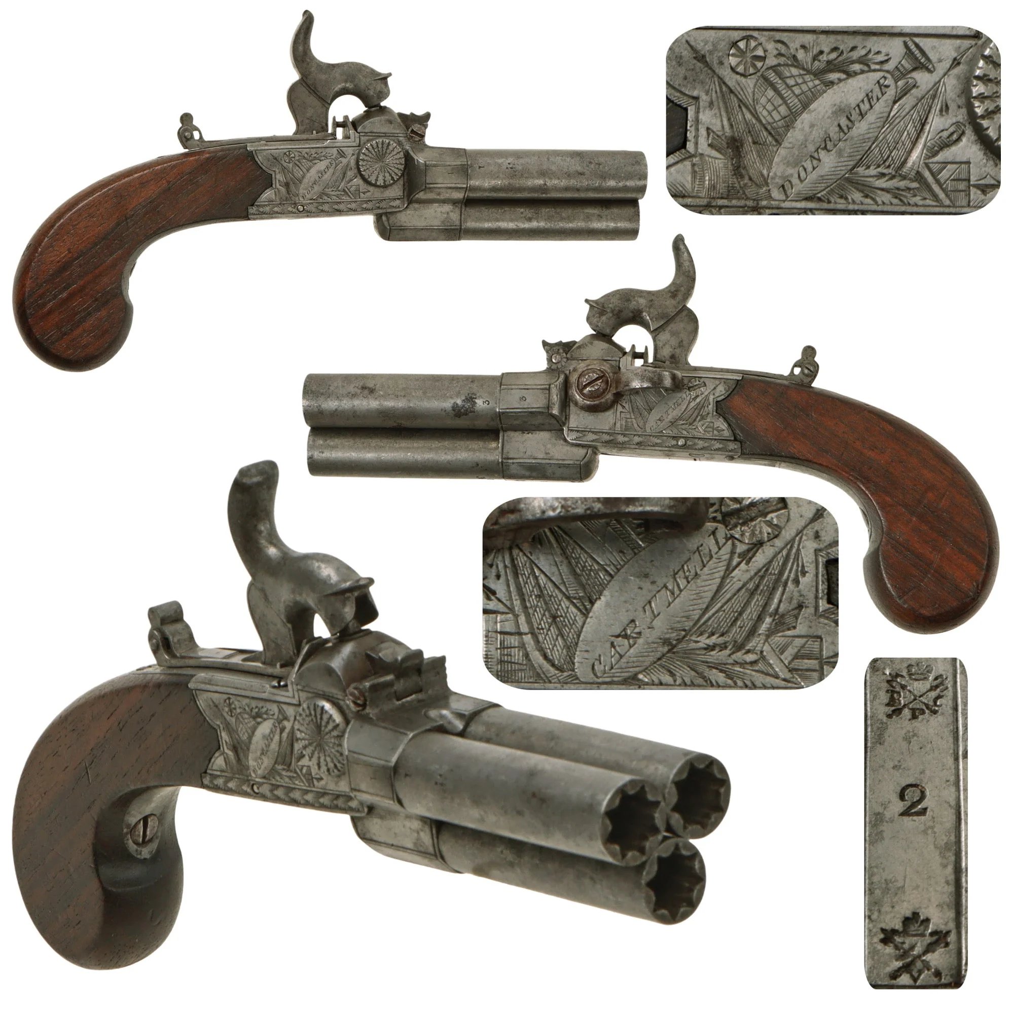 Item DescriptionOriginal Item: One of a Kind. Just acquired from a recent antique gun show, this is a very nice British three barrel pistol with turn off barrels for loading. On the left side there is a switch so one can decide which barrel will discharge. The pan has a rolling compartment each to serve one of the barrels so effectively the shooter has two additional shots at his disposal directly after the first barrel has been fired. Technically two barrels can be fired at a time, but that is not the intended use. This type of mechanism is known as a 'tap action,' and while most were 2 barrel, there were even examples made with 3 such as this example, or even 4 barrels. There is also a slide safety mechanism rear of the hammer, which locks the pan closed until the hammer is fully cocked.This pistol was originally made in flintlock, however at some point it was actually converted to percussion, something we have really never seen on a 'tap action' gun before. The ignition method almost requires there to be significant priming powder to ensure that the charge in the barrel is ignited. In this case, the frizzen was replaced with a door over the flash pan, which has a cap nipple cone on the top, which is struck by the percussion hammer. We do not know if additional powder was usually loaded under the door, but we did note that the safety still holds the door closed as it would have with the frizzen. The workmanship on the percussion hammer is VERY high, so this was a conversion done by a gunsmith, probably in England.The barrels are steel, with engraved steel boxlock, and it is fitted with a very nice flat sided walnut grip. The left side of the frame is markedCARTMELLand the other side is markedDONCASTER, for Thomas Cartmell, a known maker of these types of pistols. Based in Doncaster, Yorkshire, he operated worked from approximately 1817 to 1829 on High Street. After passing away at the age of 58, the company continued as T. Cartmell & Son. This pistol was most likely made circa 1820 and would have been perfect for an overcoat pocket for self defense or for a serving Officer to carry concealed in case of emergency.The weapon measures 7 1/4' in overall length with a screw off 2' smoothbore barrels, which are in good shape, still showing the usual wear and oxidation on the interior. They are unfortunately all seized at present, and we do not have the proper wrench to engage the grooves at the muzzle to apply more force. The bottom of the tap action has theCROWN / CROSSED SCEPTERS / BPC'proof' andCROWN / CROSSED SCEPTERS / V'viewed' marks from the English city of Birmingham on the top near the breech, used from 1813 to 1855 for black powder arms. The barrels are numbered 1 through 3, and have matching numbers stamped on their respective breeches.The action is fully functional, holding at half cock and firing at full, though it does take a strong trigger pull to get the hammer to fire. The tap action moves correctly, as does the safety, making this a really nice example. As with many we see, it has a fold-out trigger that only appears when the action is fully cocked, which then must be manually returned to the closed position. Condition is very good, with a lovely lightly oxidized patina on the metalwork, and no signs of major oxidation or cleaning. The engraving on the box lock is still crisp, and there are engraved designs elsewhere. The grip is in lovely condition, showing no major damage, just the usual denting from use and age.A lovely circa 1800 Triple Barrel tap action pistol by a known British maker, ready to research and display!Specifications:-Year of Manufacture: circa 1820Caliber: about .37' PistolAmmunition Type: Lead Ball & PowderBarrel Length: 2 inchesOverall Length: 7 1/4 inchesAction: Flintlock Top Action with Pan TapFeed System: Muzzle-LoadedNOTE: International orders of antique firearms MUST be shipped using UPS WW Services (courier). USPS Priority Mail international will not accept these. International customers should always consult their country's antique gun laws prior to ordering.Shipping RestrictionsThis product is not available for shipping in US state(s): New JerseyThis product is available for international shipping.Payment OptionsNot eligible for payment with Paypal or AmazonLegal InformationIMA considers all of our antique guns as non-firing, inoperable and/or inert. Title 18, U.S. Code, Section 921(a)(16) defines antique firearms as all guns made prior to 1899. This law exempts antique firearms from any form of gun control or special engineering because they are not legally considered firearms. No FFL, C&R or any license is required to possess, transport, sell or trade Antique guns. All rifles and muskets sold by IMA that were manufactured prior to 1899 are considered Antiques by the US BATF (United States Bureau of Alcohol, Tobacco & Firearms). Therefore, all of IMA's Antique guns may be shipped to all US States and most nations around the world.These antique guns are not sold in 'live' condition, and are not tested for the the ability to feed or load any type of cartridge. They are sold as collector's items or as 'wall hangers' not for use, and we make no guarantees regarding functionality aside from what is stated in the description. Any attempt at restoring an antique gun to be operational is strongly discouraged and is done so at the risk of the customer. By purchasing an antique gun from IMA you thereby release IMA, its employees and corporate officers from any and all liability associated with use of our Antique guns.Pre-1899 Manufacture, no licenses required, allowed to ship to almost any deliverable address across the globe. Please note that for international shipping, these MUST be shipped using UPS WW Services. International customers should always consult their country's antique gun laws prior to ordering.