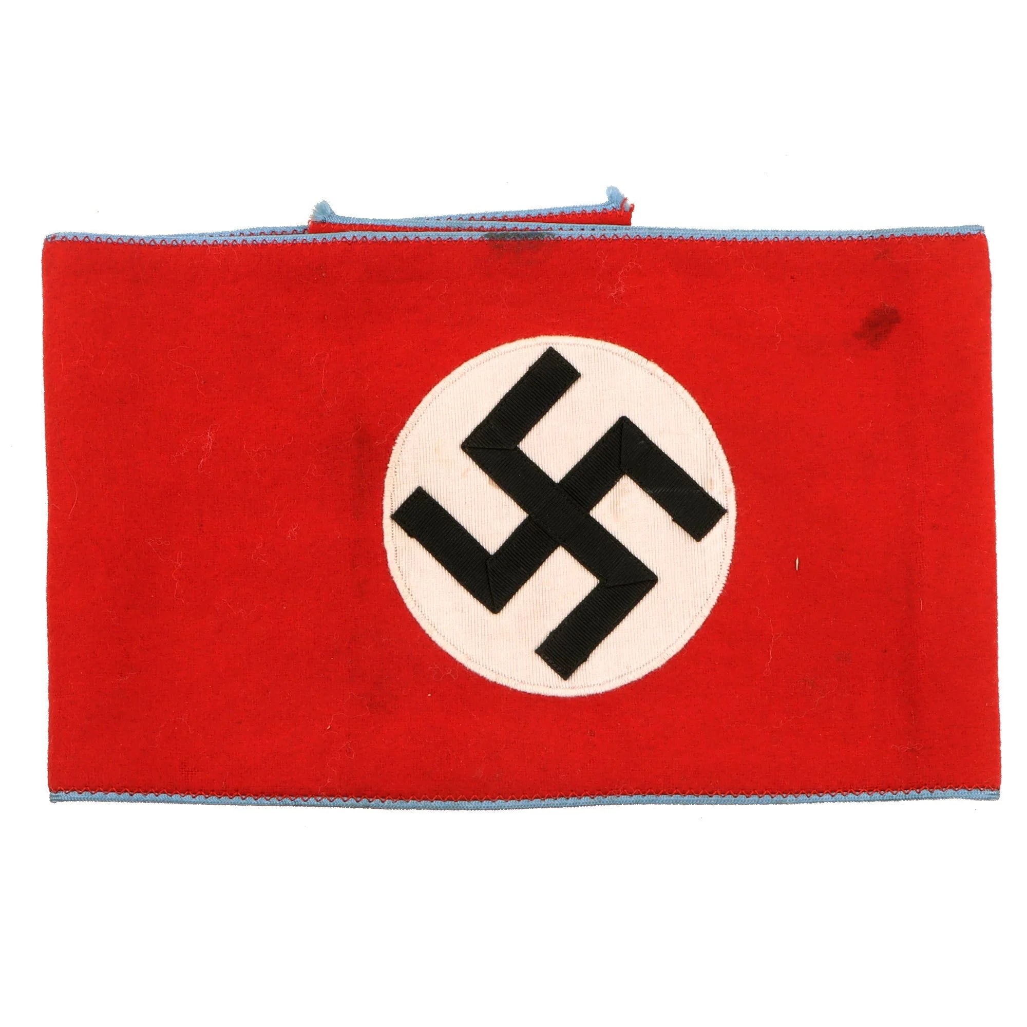 Item DescriptionOriginal Item: Only One Available. The NSDAP orNationalsozialistische Deutsche ArbeiterPartei, (National Socialist German Worker's Party), was originally founded in Munich as the DAP,Deutsche Arbeiterpartei, (German Worker's Party), on January 5TH 1919. When Adolf AH joined the DAP in the autumn of 1919 he was to reform what was basically a debating society into an active political party. Appointed as the first chairman of the party on July 29TH 1921, AH was to restructure it along para-military lines in a hierarchy.This new NSDAP structure consisted of four ascending levels of government: theOrtsgruppenleitung(Local group leadership), theKreisleitung(District leadership), theGauleitung(Regional District leadership), and theReichsleitung(National leadership). Each group was distinguished by a specific color of piping on the collar tabs and visor cap. From 1936 to 1939 in this scheme, light blue was for theOrtsgruppelevel, black forKreislevel, burgundy red forGaulevel, and gold yellow for theReichlevel. After that the Kreis level changed to white piping.Politische Leiter Anwärter(Political Leader Candidate) was the lowest rank within the extensive system of NSDAP political ranks, and existed at multiple levels of the government. Anwärter was someone who had been accepted into a government service position and the rank was issued in two degrees: one for party members and the other for non-party members. The blue piping on this example indicates that it is for theOrtsgruppe(Local Group) level. This style of armband could also be used to denoteSonderbeauftragter, or 'Specially employed persons'.This excellent armband is constructed of a red wool/cotton blend cloth with an embroidered central blackswas(hook cross) on a white rayon field, all bordered by yellow/gold cotton thread. This golden border was only seen on some examples, while others were plain. There is no other adornment except for the light blue piping borders on the edges of the armband.Total length is 20 1/4' with a width of 5 1/8'.The armband is in nearly unissued condition, showing very little wear of any kind, however there are some small stains from storage.This lovely armband would pair nicely with a uniform or a dagger! Comes ready to display.Orts Role in Municipal GovernmentAfter the founding of NSDAP Germany, the political rank of Ortsgruppenleiter was held by the chief NSDAP member in a municipal area. In many situations, town and city administration overlapped with the NSDAP political system, meaning that the traditional local government was overshadowed, if not entirely replaced, by NSDAP leadership. Traditional government titles did continue to exist, such as Bürgermeister; however, if these positions were not already held by a corresponding NSDAP official, city government was little more than a rubber stamp to NSDAP designs.During World War II, the position of Ortsgruppenleiter encompassed a large amount of responsibility and power as it was these NSDAP officials who typically ran the city civil defense systems as well as the allocation of war rations and civil relief efforts. As Germany was invaded and defeat became imminent, NSDAP leaders in major towns and cities also became ad hoc military commanders in charge of mixed-unit German forces and Volksturm units.Between 1930 and 1932, the political rank of Ortsgruppenleiter was denoted by a braided shoulder cord and a white collar bar worn on a NSDAP Party brown shirt. After 1933, the rank was denoted by two light yellow collar bars. The actual rank of Ortsgruppenleiter was phased out of the Party in 1939, replaced by a large number of expanded paramilitary political titles. The position of Ortsgruppenleiter was after this time typically held by a Party Member with the rank of Abschnittsleiter, paired as well with a political armband denoting the specific position of Ortsgruppenleiter.Shipping RestrictionsThis product is available for international shipping.Shipping not available to: Australia, France, or GermanyPayment OptionsNot eligible for payment with Paypal or AmazonLegal InformationDue to legal restrictions this item cannot be shipped to Australia, France or Germany. This is not a comprehensive list and other countries may be added in the future.