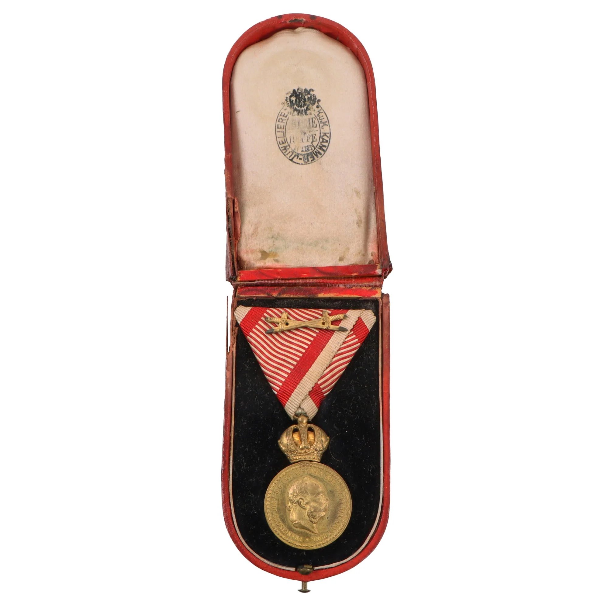 Item DescriptionOriginal Item. Only One Available. The Military Merit Medal (or Militär-Verdienstmedaille in German) is a military decoration of the Empire of Austria-Hungary founded by Emperor Franz Joseph I on March 12, 1890 and only awarded to officers and officials of similar rank. The Military Merit Medal is often referred to as the 'Signum Laudis' (Latin for 'Sign of Praise') after the inscription on the reverse of the medal. It was awarded in peacetime for meritorious service and in wartime for outstanding acts, including bravery or military merit.The medal originally came in one class, a gilt bronze version, and repeat awards were not authorized. On March 26, 1911, a Silver Military Merit Medal was founded, intended to reward those who would have earned a second award of the Military Merit Medal. It too could be awarded on either of the two ribbons. On December 13, 1916, the addition of a pair of gilt-crossed swords on the ribbon was authorized to recognize a higher grade of wartime merit.The Military Merit Medal became obsolete with the fall of the Austro-Hungarian monarchy in November 1918.This is a great example with a scarce second award clasp at the top. The medal is in great shape and comes in the original black velvet-lined case with a maker's mark on the interior lid. The top of the lid has the Austrian coat of arms. Some of the finish is flaking as shown.The case has some damage and is partially torn from the hinge, so the closure no longer functions.A great example, ready for display.Shipping RestrictionsThis product is available for international shipping.Payment OptionsEligible for all payments - Visa, Mastercard, Discover, AMEX, Paypal & Sezzle