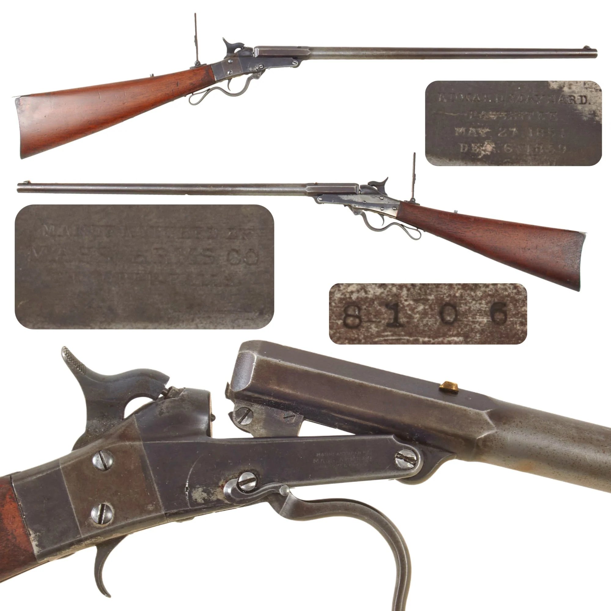 Item DescriptionThe Maynard Carbine was one of a multitude of weapons produced during the U.S. Civil War to meet the demand for usable firearms. As originally designed, the carbine was one of many 'capping breech loaders', which would use some type of cartridge without any integral primer cap. In the case of the Maynard, it used a metallic cartridge with the powder and bullet already installed. There was a small hole in the center of the base, which would be ignited by a standard percussion cap fitted to a nipple, or by a tape primer system ignited by a firing pin. After the outbreak of the Civil War, a simplified Second Model was introduced and put into production in 1863, which did away with the Maynard tape primer, and used percussion caps only.The cartridge, which had a wide rim permitting swift extraction, was reloadable up to 100 times. This proved to be a significant feature for the Confederate troops equipped with it. Another significant feature was that the use of a metallic cartridge prevented gas escape at the breech, a serious concern for many of the early externally primed breechloaders. The design was also advantageous in that it was easily converted to metallic cartridges, which had become increasingly popular by the end of the Civil War. The writing was on the wall that the day of separate-primed cartridge was over.Edward Maynard and the Massachusetts Arms Co. realized they must do something about more modern cartridges. Early in February 1873, after considerable experimentation, Maynard had both the self-contained cartridge and the mechanism to fire it. This new cartridge had a very wide, thick base, beveled so that it resembled a saucer; it employed a special Berdan primer. The cartridge was wide enough so that it could be grasped with the fingers after being started from the chamber by the rather weak retractor patented some years earlier. Now the Maynard sporting rifle had ammunition that placed it in a better competitive position, and business began to pick up.This is a lovely example of one of the 'Improved Model' rifles, usually referred to as the 'Model 1873'. There was a later 'Model 1882' that was made to use more of the commercially available cartridges. The right side of the action is crisply marked with the manufacturer information and reads:-MANUFACTURED BYMASS. ARMS COCHICOPEE FALLS.The left side is marked with the patent information the action is covered under:-EDWARD MAYNARD.PATENTEE.MAY 27. 1851DEC 6. 1859We do not see any '1873' stamp, which was a separate stamping, so this example may have missed being stamped. We also noted that the firing pin base is a bit offset, as it would be in percussion rifle, so this is probably an early example of the Model 1873, and is marked on the lower receiver tang with serial number8106. We had considered that maybe it was converted from percussion, however .40 was not a caliber these were ever made in while available in percussion, and the barrel is fitted with an extractor, which were also not used during the percussion era. It is fitted with the correct long range aperture sight on the upper tang, as is correct for this model. There is also a sight dovetail on the barrel, which has been plugged with a piece of brass.The rifle is in lovely condition, still retaining the original blued finish well, and the butt stock is in fantastic condition. We checked the functionality, and there were no deficiencies to note. The bore is in excellent condition, showing a bright finish with crisp lands and grooves. There is just a bit of past fouling and wear, now cleaned away and polished bright.If you were looking for a great example of an early design single shot Target Rifle descended from a Civil War carbine design, this is it!Specifications-Year of Manufacture: circa 1875Caliber: .40-caliberAmmunition Type: Centerfire CartridgeBarrel Length: 26 InchesOverall Length: 42 5/8 InchesAction: Top Break with Back Action Percussion Lock.Feed System: Single ShotMore on the Maynard Carbine:More than 20,000 Maynard Second Model Carbines were produced between 1863 and 1865 to arm Federal cavalry units. Unlike the First Model Maynard, the Second Model was produced exclusively in .50 caliber. In addition, the Maynard tape primer system, patchbox, and tang sight common to the First Model were omitted, and the profile of the buttstock differs between these two variants.This percussion carbine was patented by Edward Maynard of Washington, D.C., December 6, 1859, and manufactured by the Massachusetts Arms Company of Chicopee Falls, Massachusetts. Introduced into United States service in the late 1850s, it was put into mass production in 1861 and performed well in the hands of Federal troops. It has a 20-inch barrel and measures 36 7/8 inches in overall length, and has no forestock. The barrel tips for loading when the trigger guard lever is lowered. Percussion caps were required to fire a perforated .50 caliber brass cartridge that required hand extraction. Early versions included the Maynard tape primer system, but wartime exigencies forced its elimination. Both barrel and buttplate were blued, and the receiver of this arm was casehardened. Some were tinned for Navy use.Dr. Edward Maynard (1813-1891) was both a brilliant dentist and a gifted inventor. Born in Madison, New York, Maynard entered the United States Military Academy at West Point, but was later forced to resign due to poor health. Prior to the Mexican War, Maynard invented a mechanical priming system for use with percussion arms which was intended to replace the copper primers that had been used almost since the invention of this ignition system.The Maynard Tape Primer consisted of a thin shellacked paper tape which contained fulminate of mercury 'packets' imbedded in its surface. When the hammer was cocked, a single primer would automatically advance over the ignition cone, or 'nipple,' thus eliminating the need to prime the arm as a separate step in the loading process. This syste