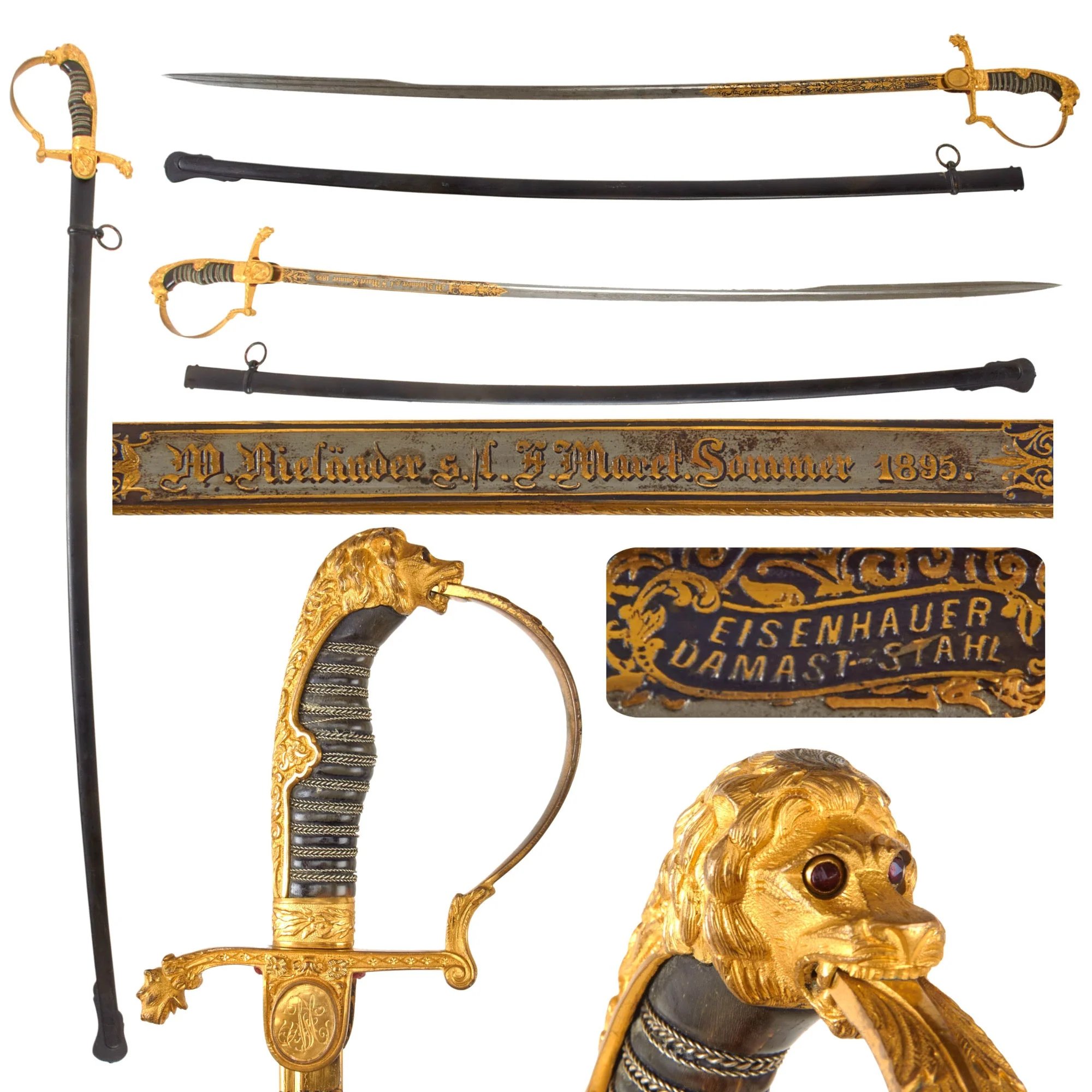 Item DescriptionOriginal Item. One-of-a-Kind. This is an outstanding Imperial German Field Artillery presentation sword with a beautiful triple-etched gold-inlaid and fire-blued Damascus steel blade and incredibly ornate ruby-eyed Lion's Head hilt decorated with foliage and other motifs, with the rain chape to one side bearing a set ofCrossed cannonsand to the other side bearing an engraved shield with the initialsF.M.for F. Maret. The hilt retains very much of the original gilt, and the wire-wrapped horn grip shows moderate wear with some looseness in the wire.The 32' blade is triple-etched with etchings on all three sides. It is gold-inlaid and fire-blued on the first 1/3rd, with one side bearing a panel reading in gold:W. Rielӓnder s./l. F. Maret. Sommer 1895.W. Rielӓnder 'to his friend/comrade' F. Maret. Summer 1895The other side has the phrase'Eisenhauer Damast-Stahl'which just denotes that it is Damascus steel. Under the rain chape on one side is the'King's Helmet'trademark ofWEYERSBERG KIRSCHBAUM & CO SOLINGEN.WKC is one of the more famous makers in the legendary 'City of Blades', Solingen. They were chosen for their pre-eminence even within the center of German edged weapon manufacture to make the swords celebrating the Kaiser's day that Celebrated the city.The hilt is meticulously crafted with the crossguard ending in a Puma's head, and the gilt is extremely-well retained in some places. The lion's head pommel has embedded ruby eyes and displays beautifully. The sword measures roughly 37' overall.The straight steel scabbard is in good order with the majority of the black paint retained, with the single suspension ring intact with denting and paint loss.This is an outstanding damascus steel presentation sword presented in 1895. Ready for further research and display!Specifications:Blade Length: 32'Overall length: 37'Scabbard Length: 33 3/4'Shipping RestrictionsThis product is available for international shipping.Payment OptionsEligible for all payments - Visa, Mastercard, Discover, AMEX, Paypal & Sezzle