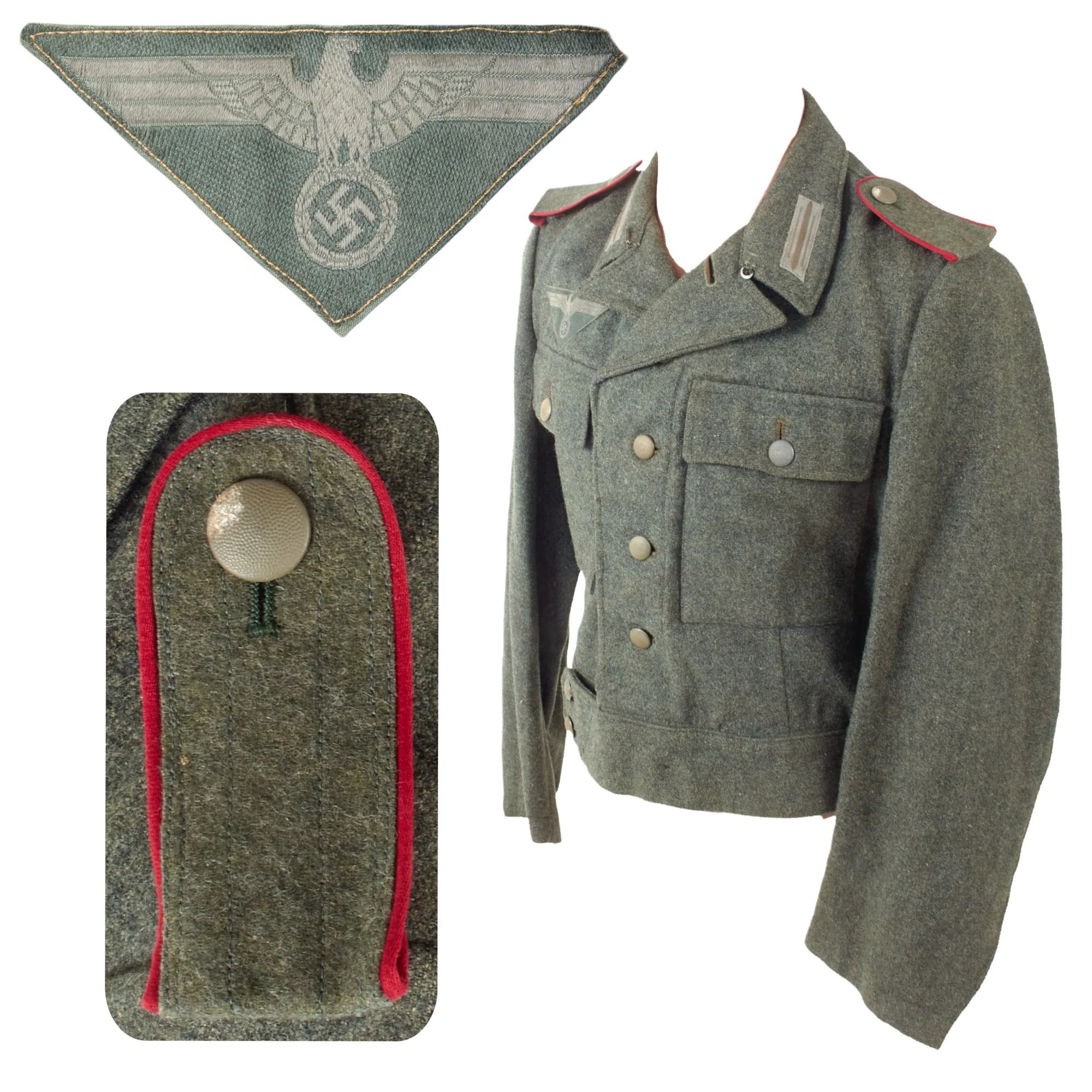Item DescriptionOriginal Item: Only One Available. Towards the end of the Second World War in late 1944, Germany was looking to to cut down on tailoring and production costs as material shortages continued to mount. The Wehrmacht's answer to this issue was the introduction of the M44 pattern uniform. Similar in appearance to the British Battle Dress or the related US 'Ike' jacket, the M44 was unlike any other German pattern uniform, and the first major deviation in uniform design since 1936. The front still featured the button front closure, but the the tunic skirt was shortened to waist length, the number of pockets was reduced to two. The tunic could be worn with an open or closed collar.Some versions also had additional internal pockets as well as an internal belt, but on later examples these were often omitted. Additionally, the rarely used and complicated internal suspension system used on earlier designs was finally dropped. The color was the newFeldgrau44, a drab greenish-brown. The standard German insignia would still be worn, such as the breast eagle, collar tabs (litzen), and shoulder straps. Except for the elite Panzer-Lehr-Division, which field-tested the new uniform in summer 1944 before its approval for general issue, the M44 was usually seen at the front only in the war's last months and generally on the greenest of troops. Due to rushed production, many were not even fully outfitted with all the correct insignia.This is a very interesting example of a Heer Army Issue M44 tunic, which looks to originally have been an M43 tunic, but was period converted / shortened to the M44 pattern. There are belt clip holes on the right and left side, but they are too high to really be of use, and we can see the stitches and cut off fabric on the interior bottom where material was removed. We are not sure why this alteration was done, though it's always possible that the bottom of the tunic was damaged, or perhaps the owner wanted to have the new more streamlined look.As it is now, the tunic was made from the standard square woven wool fabric, in the correct Feldgrau color used during the late war period. It features two un-pleated chest pockets with square flaps, each secured with a magnetic pebbled button. The front closure features four of the same buttons on the right breast flap meeting an equal number of reinforced buttonholes on the left flap. The bottom features an additional waist closure strap, with an internal button (missing) and added button hole, along with two added buttons further to the right. The buttons are oxidized a bit on the back, so we cannot see any maker marks, and all are sewn directly to the fabric. They still retain much of the original painted finish on the tops. The interior is mostly unlined, as is correct, and there are no pockets that we can see.The tunic is fitted with the correct insignia, including late war enlisted gray BeVo style litzen on the collar, and a green / gray triangular BeVO machine embroidered breast eagle, totally correct for this type of tunic. We cannot see any signs that other insignia were sewn onto the tunic, which was fairly typical for examples made late in the war. The button attached styleMannschaften Schulterklappen(Enlisted shoulder straps) are the correct later pattern field gray wool material, withbordeauxrot(Bordeaux Red) piping, theWaffenfarbe(Corps Color) during WWII for HeerNebelwerfer(Smoke Thrower) Rocket and Chemical Troops. There are no rank chevrons or pips on the sleeves, which indicates the lowest enlisted rank of Soldat, or a U.S. Army Private. We were not able to find any specialized rank name for the chemical troops like there is for Cavalry or Artillery.Overall condition is very good, showing light wear to the exterior, and no major damage such as tears or repairs, though we do not know what the tunic was like prior to being converted. There are a few small moth holes, very common on the loose rough weave fabric used for these tunics. We definitely recommend these be stored with moth balls to avoid damage.A lovely late war German WWII Smoke and Chemical Troopers Enlisted uniform, ready to research and display!Approximate Measurements:-Collar to shoulder: 10'Shoulder to sleeve: 24'Shoulder to shoulder: 15'Chest width: 19'Waist: 15'Hip: 15'Front length: 24'Shipping RestrictionsThis product is available for international shipping.Shipping not available to: Australia, France, or GermanyPayment OptionsNot eligible for payment with Paypal or AmazonLegal InformationDue to legal restrictions this item cannot be shipped to Australia, France or Germany. This is not a comprehensive list and other countries may be added in the future.