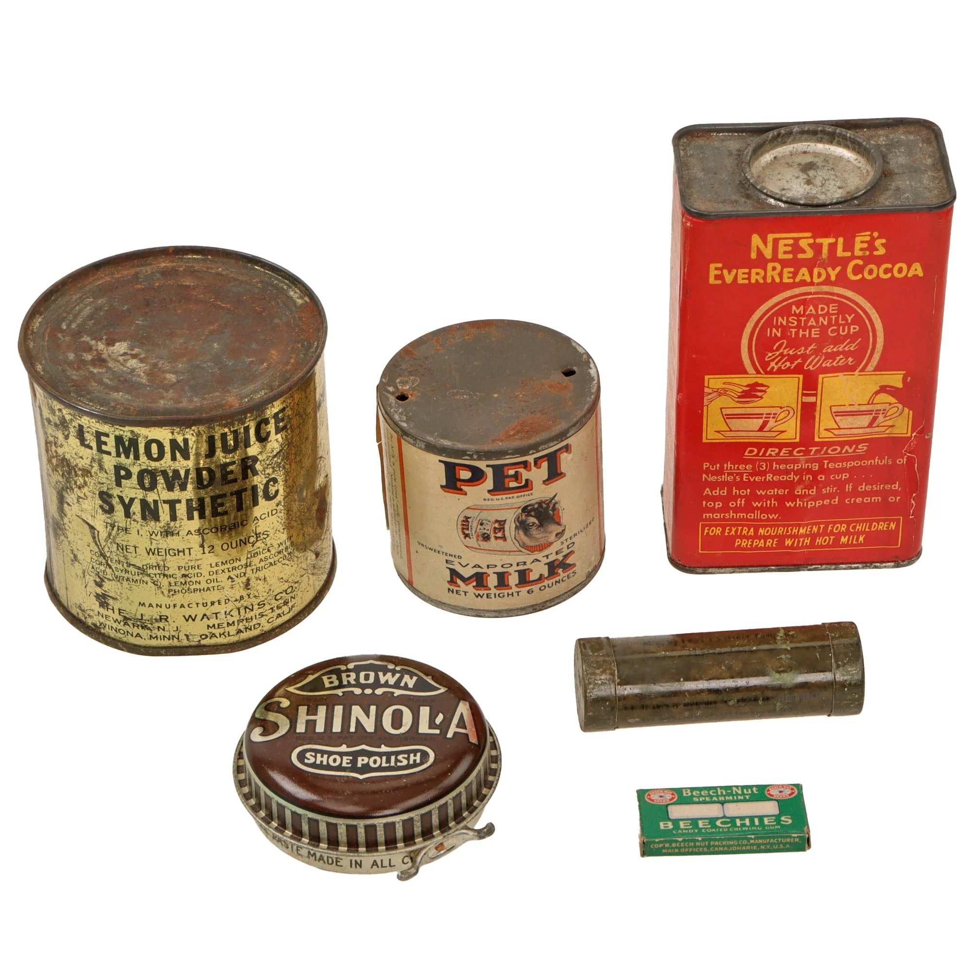 Item DescriptionThis is a great lot of WWII personal rations commonly found in the kit of an American G.I. This lot has some great items that will definitely help spruce up your WWII G.I. display.The lot includes:- Sealed tin of Lemon Juice Powder Synthetic 12 ounces. J.R. Watkins Co.- Empty tin of Pet Evaporated Milk- Empty pack of Beechnut Spearmint gum.- Sealed tin of Shinola Brown Shoe Polish- Paint, Face, Camouflage stick, sealed. Markings worn.- EverReady Restle's sweet milk cocoa tin, empty.A lovely lot of items, ready for further research and display.Shipping RestrictionsThis product is not available for international shipping.Payment OptionsEligible for all payments - Visa, Mastercard, Discover, AMEX, Paypal & Sezzle