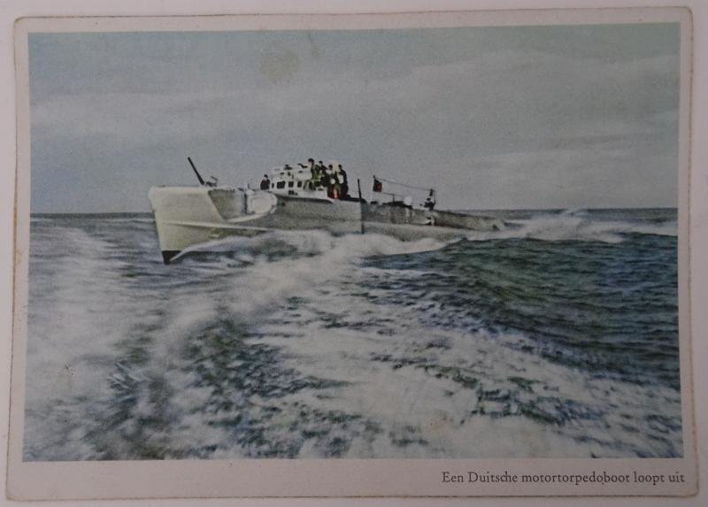 in a very nice condition a german ww2 post card with dutch text . the text translated from Dutch 'a german motor torpedo boat runs out' very nice for display