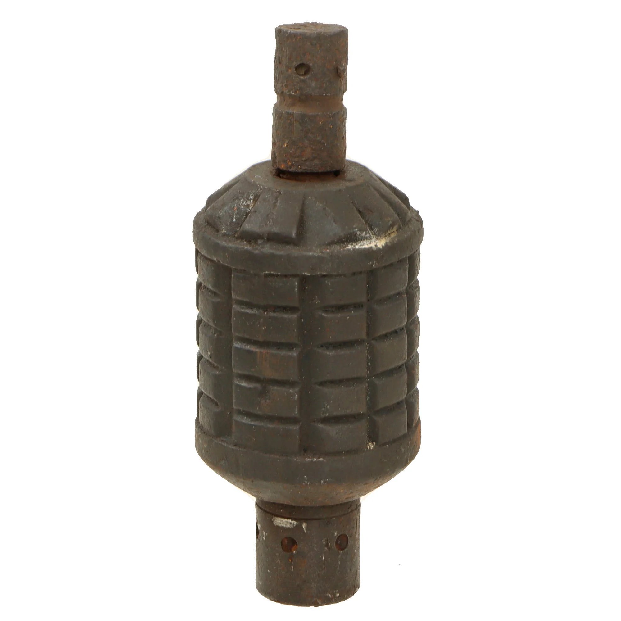Item DescriptionOriginal Item. Only One Available. This is an exceptionally rare excellent condition inert demilitarized genuine Japanese Type 11 Incendiary Smoke Grenade. This example is offered in rough relic condition with a now-loose fuse and removable lower booster (the booster is almost always missing!). The fuze does not fit in the top hole anymore, and the pin and pull string are gone. This is the third example of a Type 11 we have ever offered.Unloaded or dummy grenades, artillery shell casings, and similar devices, which are cut or drilled in an BATF-approved manner so that they cannot be used as ammunition components for destructive devices, are not considered NFA weapons. This example is in total compliance and is NOT AVAILABLE FOR EXPORT.The grenade does not have a removable top cap and instead appears fragmented on this section. The fuse cover is gone. The fuse on this example is extremely oxidized and it is now loose in the hole, it no longer screws into the body but should look okay for display sitting inside.The booster can still be removed. This is a very rough relic example of a scarce Japanese grenade. Ready for display.Shipping RestrictionsThis product is not available for international shipping.Payment OptionsNot eligible for payment with Paypal or AmazonLegal InformationTotally inert, cannot be converted to an explosive device, not available for export. This item is completely legal within the USA. International Military Antiques, Inc observes all Federal, State and Local laws. Everything for sale on ima-usa.com is completely legal to own, trade, transport and sell within the United States of America.All deactivated ordnance sold by IMA, Inc is engineered to be inoperable according to guidelines provided by the US Bureau of Alcohol, Tobacco, Firearms and Explosives (BATF).