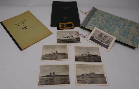 in a nice used condition a kriegsmarine grouping set with a photo album . 2 manuals books. and a shoulder board .and 6 kriegsmarine post cards. the photo album with 226 pictures from germany and norway and e shoulder board of rang of a obersteuermann nice to explore further very nice for display