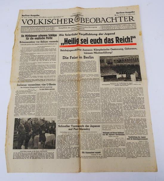 in a used condition german a ww2 newspaper 'volkischer beobachter 'it's 1 page' with date ' March 23 , 1942' very nice for display in used condition