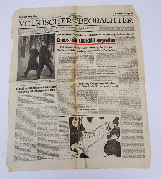 in a used condition german ww2 newspaper 'volkischer beobachter 'it's 1 page' with date ' March 24 , 1942' very nice for display in used condition
