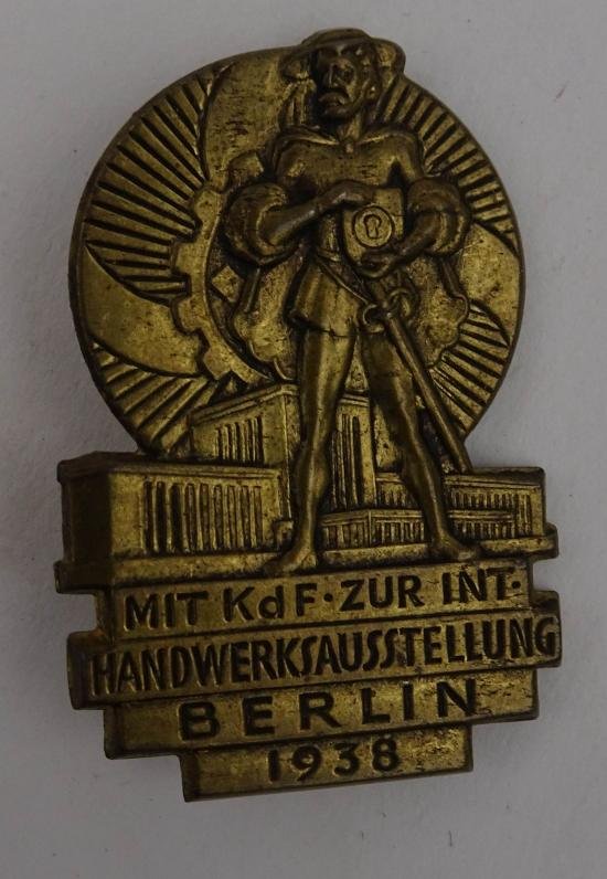 in a used condition a german VERANSTALTUNGSABZEICHEN with the text'Mit KdF zur Internationalen Handwerksausstellung Berlin 1938'. very nice for display