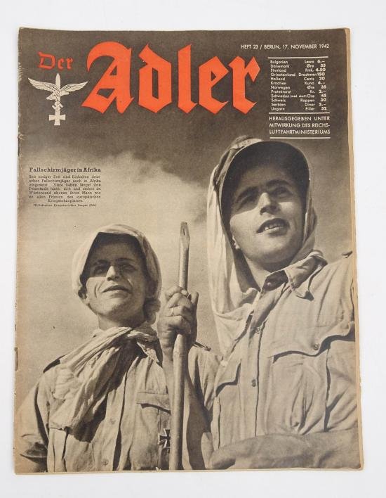 der adler was a biweekly Nazi propaganda magazine published by the Scherl Verlag, founded by August Scherl, with the support of the Luftwaffe High Command. From 1939 to 1944, 146 magazine issues were published in total.this is 17 nov 1942in good condition. , overall a very nice condition with a great cover