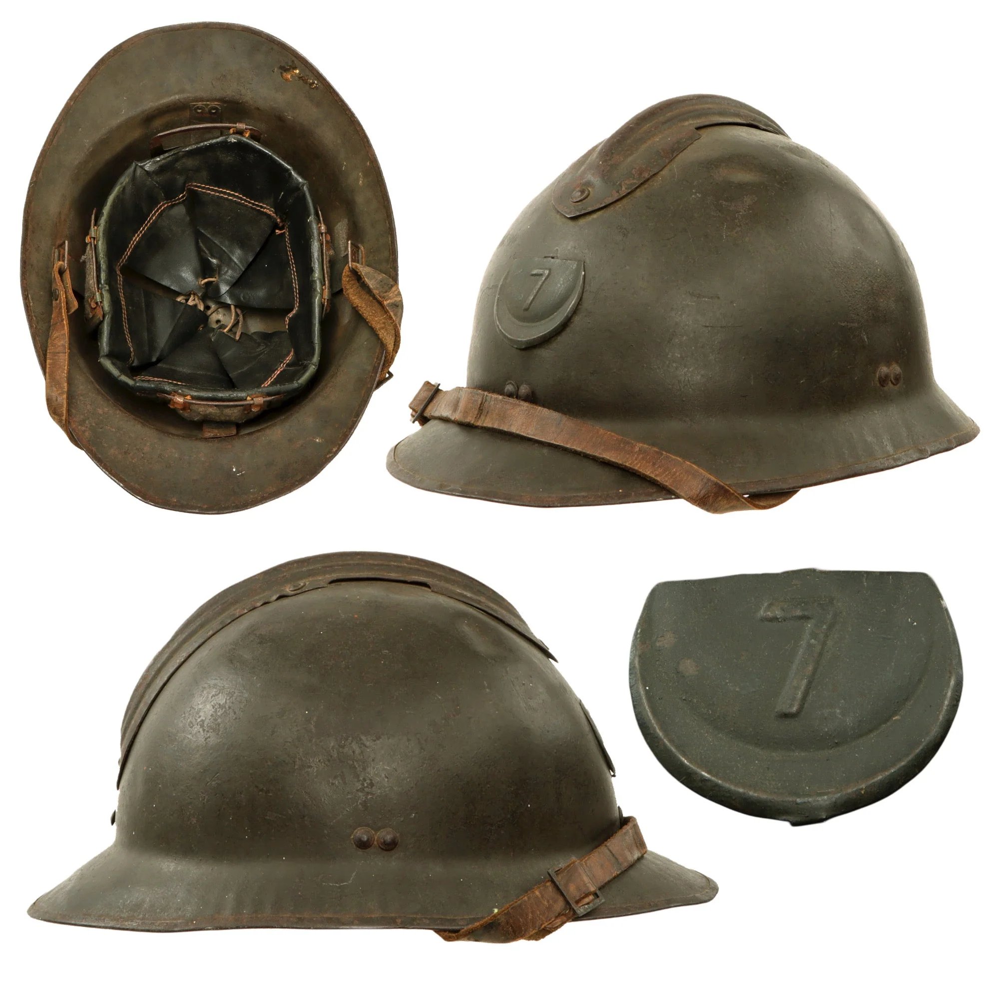 Item DescriptionOriginal Item: Only One Available. Excellent genuine World War II model 1926 French North African campaign Zouave helmet. The helmet retains the original olive green paint and is complete with the French North African Zouave badge with a 7 in place of RF to front. The 7 likely denotes the Zouave regiment. Size is approximately US 7.25 (58cm). Features a wonderful complete original leather liner in a heavily worn condition. The liner finish is cracking around the rim of the liner band but the fingers are all in good shape. The chinstrap is present and in one piece, seated on the front brim. Overall condition of the helmet is very good, shell shows some minor dings, scratches and paint loss consistent with age. These helmets are rare and very hard to find in such good condition.In 1926 the Adrian helmet was modified by being constructed of stronger steel and simplified by having the main part of the helmet stamped from one piece of metal, and therefore without the joining rim around the helmet that characterizes the M15. The large ventilation hole under the comb, which had been a weak point of the old design, was also replaced with a series of small holes. The M26 helmet continued in use with the French Army until after World War II, and was also used by the French police up to the 1970s.The Zouaves were a class of light infantry regiments of the French Army serving between 1830 and 1962 and linked to French North Africa; as well as some units of other countries modelled upon them. The zouaves, along with the indigenous Tirailleurs Algeriens, were among the most decorated units of the French Army.It was initially intended that the zouaves would be a regiment of Berber volunteers from the Zwawa group of tribes in Algeria—thus the French term zouave—who had gained a martial reputation fighting for local rulers under the Ottoman Empire. The regiment was to consist of sixteen hundred Zwawa Berbers, French non-commissioned officers and French officers. Five hundred Zwawa were recruited in August and September 1830. Twelve years later, zouaves began to be recruited almost exclusively from Europeans, a policy which continued until the final dissolution of these regiments after the Algerian War.In the 1860s, new units in several other countries called themselves zouaves. The Papal Zouaves were organized by Louis Juchault de Lamoricière, a former commander of North African zouaves, while a former zouave sergeant, François Rochebrune, organized the Polish Zouaves of Death who fought against Russia in the January Uprising of 1863–64. In the 1870s, former Papal Zouaves formed the cadre for a short-lived Spanish zouave unit. The 'zouave' title was also used by Brazilian units of black volunteers in the Paraguayan War, possibly due to a perceived link with Africa.In the United States, zouaves were brought to public attention by Elmer E. Ellsworth, who created and ran a drill company called the 'Zouave Cadets'. The drill company toured nationally. Zouave units were then raised on both sides of the American Civil War of 1861–65; including a regiment under Ellsworth's command, the 11th New York Infantry—the New York 'Fire Zouaves'.The distinctive uniforms of French and other zouave units was of North African origin. It generally included short open-fronted jackets, baggy trousers (serouel), sashes, and a fez-like chéchia head-dress.Shipping RestrictionsThis product is available for international shipping.Payment OptionsEligible for all payments - Visa, Mastercard, Discover, AMEX, Paypal & Sezzle