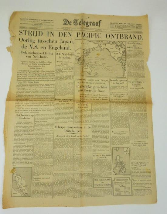 a Dutch newspaper the 'de telegraaf 'in a used condition a Dutch newspaper 'de telegraaf dated December 8 , 1941 . in a used condition but very nice for display(note it is 1 page)