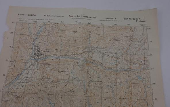 ïn very nice condition a wehrmacht map off 'predazzo italy ' with the text 'deutsche heereskarte ' dated 1944 in very nice condition miss a small corner. but can be seen on the picture