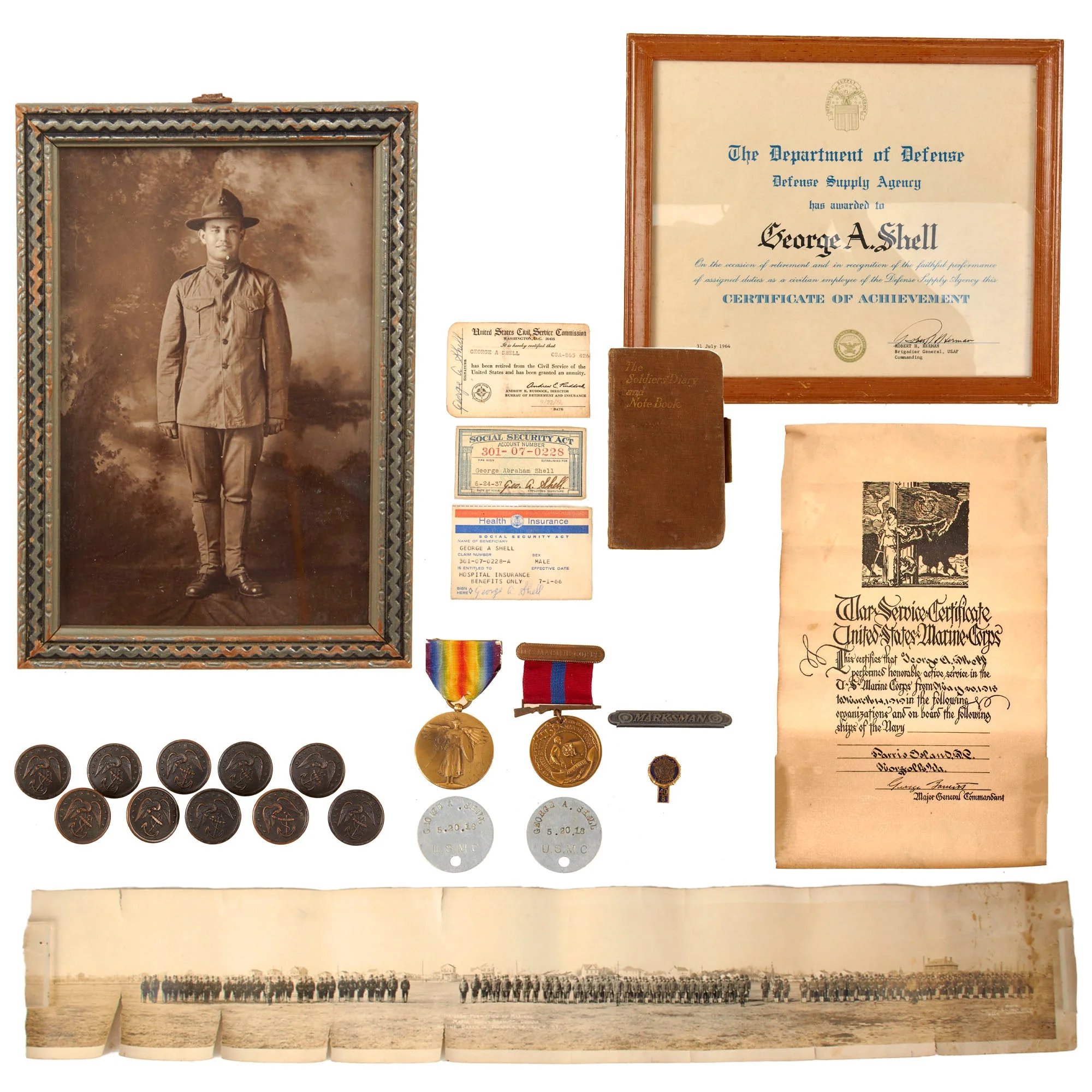 Item DescriptionOriginal Items. One-of-a-Kind Group. This is the extensive dog tag & ephemera grouping belonging to Marine Corps Private George Abraham Shell, who enlisted on May 20th, 1918 at Parris Island, South Carolina. Shell remained stateside during the duration of the war, and later worked for the Department of Defense.The grouping includes:- Shell's two USMC Dog Tags, very rare to find on their own. Marked with his date of enlistment, 5.20.18.- Shell's USMC Good Conduct Medal numbered 42406, with the accompanying Headquarters US Marine Corps document dated January 15th, 1921, noting the same number of medal. It is very rare to find these properly attributed!- Shell's WWI Victory Medal.- Shell's official US Marine Corps discharge document signed by Colonel George C. Thrope, recipient of the Marine Corps Brevet Medal for Bravery, extremely rare.- Death of Veteran certificate presented to Family during Richard Nixon's presidency.- Army Service Forces Department 'Checker with the Transportation Division' certificate Merit Award, dated June 26th, 1946.- 4 ΒΎ x 6 ΒΎ' Framed photo of Private Shell in uniform wearing a P1912 Campaign hat. Great condition.- 10 Marine Corps greatcoat buttons taken from Shell's greatcoat.- Marksman Badge awarded to Shell.- Shell's Social Security card, health insurance card, and Civil Service card.- Shell's small diary logbook with very few entries but some nice recipes in the back.- 10 ΒΎ x 12 ΒΎ' framed Certificate of Achievement from Department of Defense on the occasion of his retirement on July 31st, 1964. Good condition.- Yardlong photo of marines stateside, extreme damage and tearing with pieces broken off.- Rolled 11 x 18 ΒΌ' USMC War Service Certificate of Shell with his enlistment, discharge, and stations listed. Could be framed.This is an outstanding WWI Marine Corps grouping, ready for further research and display!Shipping RestrictionsThis product is available for international shipping.Payment OptionsEligible for all payments - Visa, Mastercard, Discover, AMEX, Paypal & Sezzle