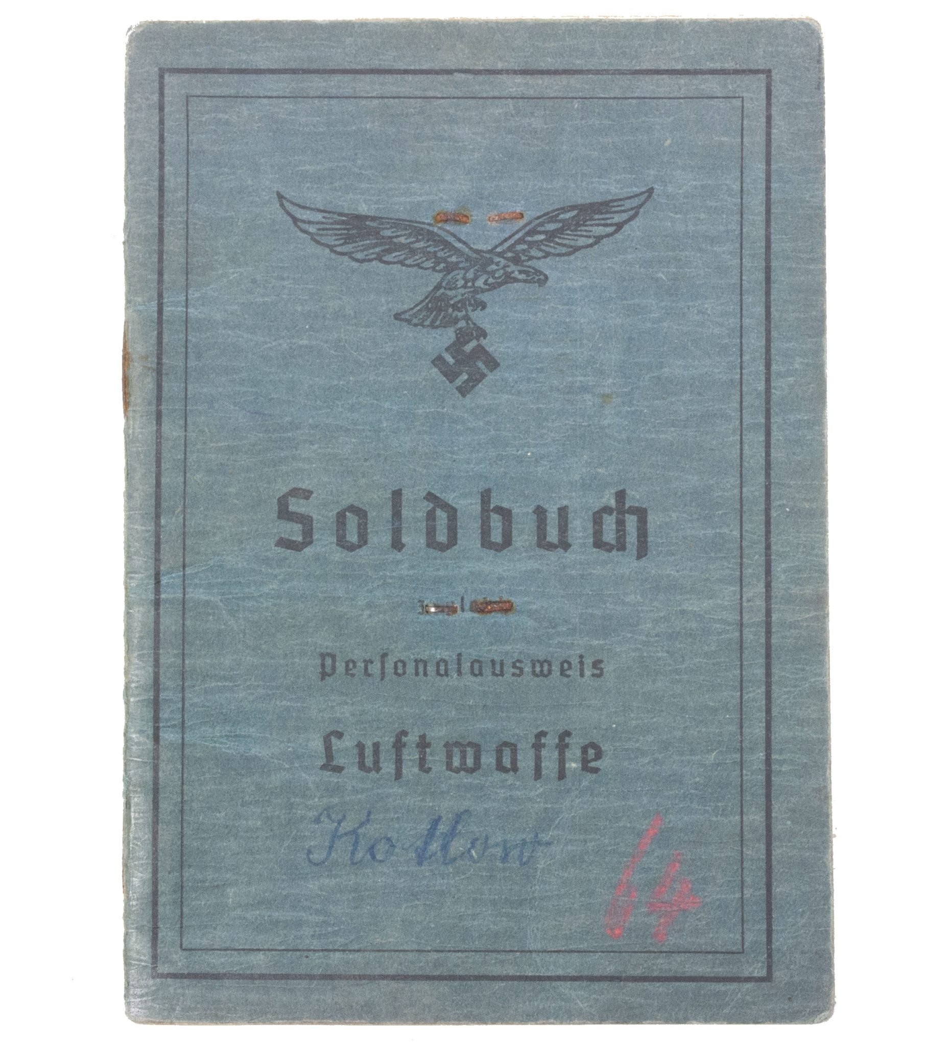 Luftwaffe Soldbuch. Name to Flieger Ewald KotlowSeefl. H. Kdtr Büg/RügenPassphoto in Luftwaffe uniform.Booklet opened on September 28, 1944.Unresearched.