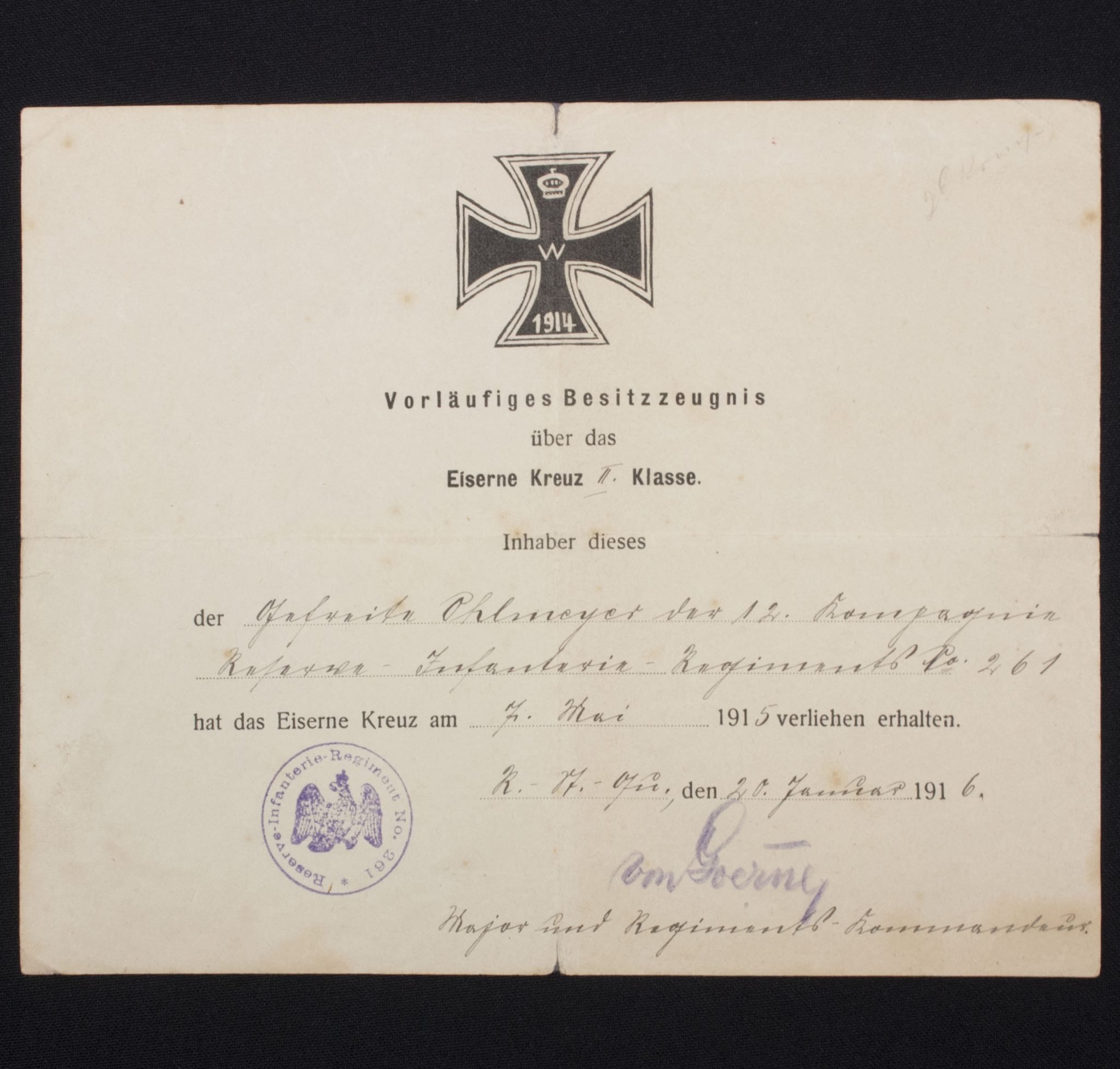 WWI Verläufiges Besitzzeugnis Eiserne Kreuz II Klasse (EK2)