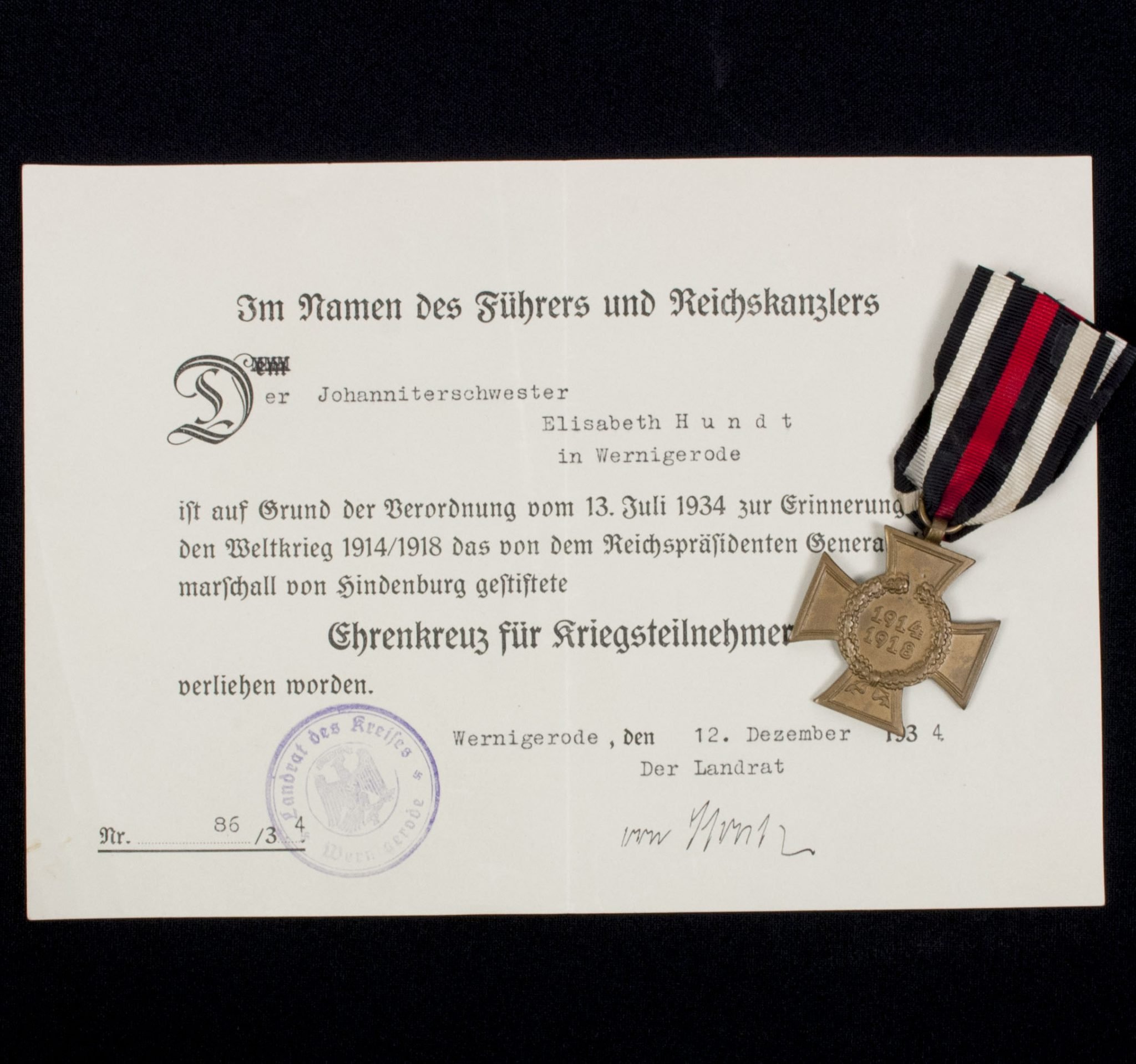 Ehrenkreuz für Kriegsteilnehmer + citation (Johanniterschwester).In good condition.Citations for a Johanniterschwester are very rare to find.