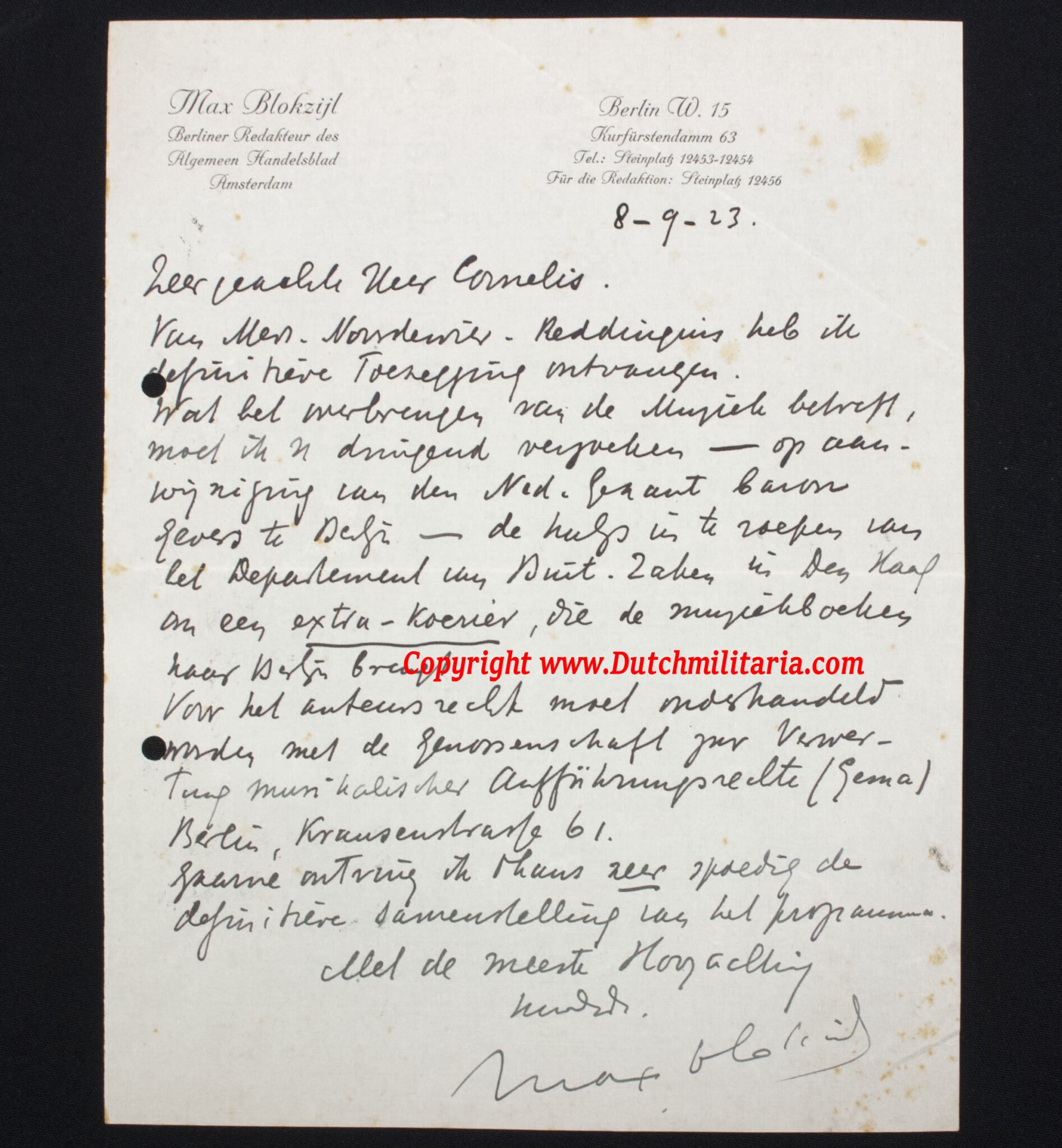 This is an early original handwritten letter by Max Blokzijl. Written in 2023 when he was still working for the dutch Algemeen Handelsblad, as editor stationed in Berlin.The letter is about programmbooklets for a concert on occasion of the 25 year jubilee of queen Wilhelmina (this actually took place on 22 september 1923).Original very early handwritten letter, actually the first such an early one i've ever had. Very hard to find from the Berlin period of Max Blokzijl.Rare!