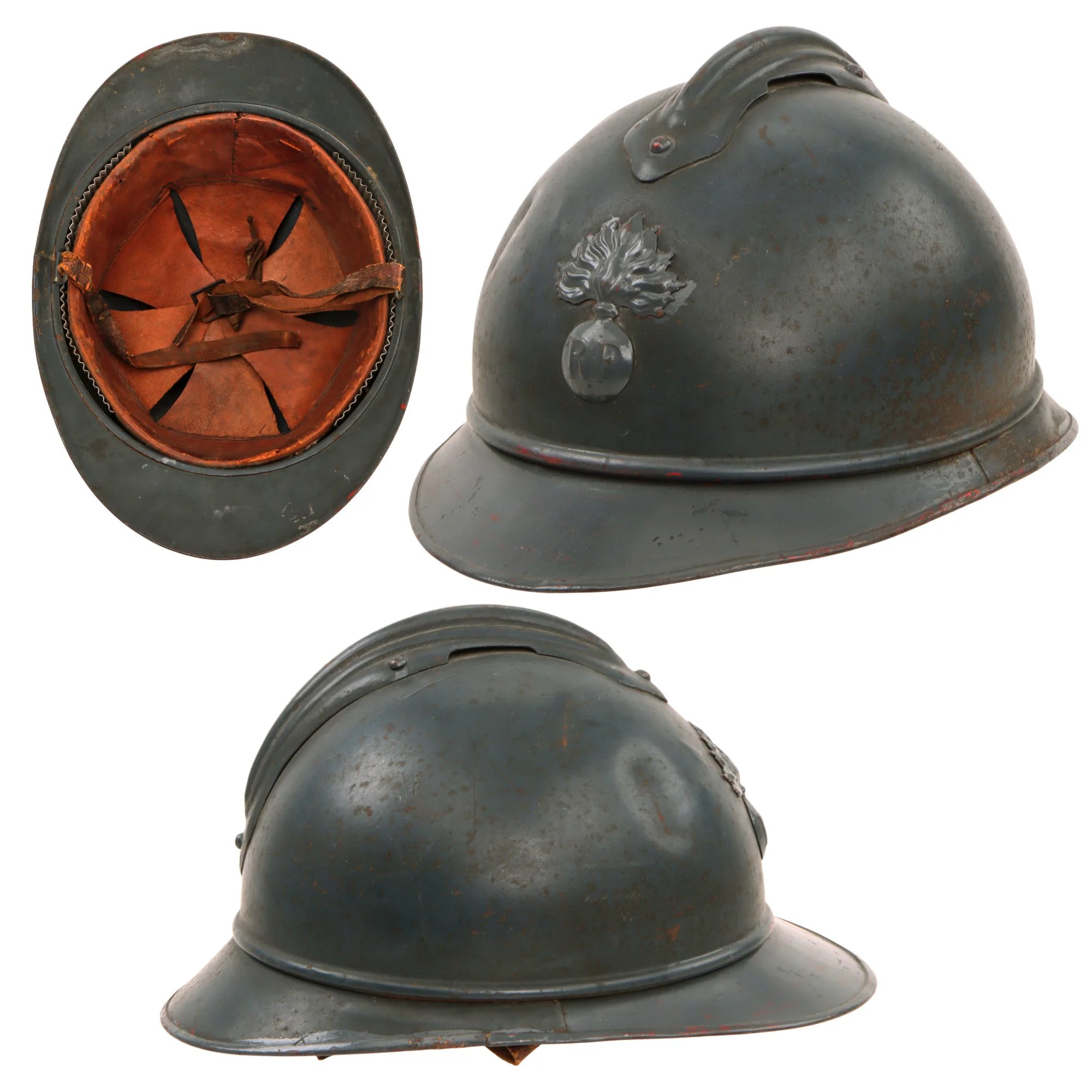 Item DescriptionOriginal Item: Only One Available. This is a very nice example of a genuine World War I Model 1915 French Army 'Adrian' Infantry Officer's parade helmet. The helmet retains the original olive green paint and is complete with the French RF Flaming bomb badge to front. It is made of light weight aluminum, and would be much more comfortable to wear on parades due to the reduced weight. The chinstrap is the officer's braided version, stretched taut over the front brim with a buckle in the center.The helmet still retains the original liner, which is in very good condition, with the leather still supple. The chin strap has also fared well, with the leather now a bit weak, and the buckle still in good shape. Size is approximately US 7.25 (58cm).A great chance to pick up a rare French parade helmet, ready to display!The Adrian helmet was an influential design of combat helmet originally produced for the French Army during World War I. Its original version, the M15, was the first standard helmet of the French Army and was designed when millions of French troops were engaged in trench warfare, and head wounds from the falling shrapnel generated by indirect fire became a frequent cause of battlefield casualties. Introduced in 1915, it was the first modern steel helmet and it served as the basic helmet of many armies well into the 1930s. Initially issued to infantry soldiers, in modified form they were also issued to cavalry and tank crews. A subsequent version, the M26, was used during World War II.At the outbreak of World War I in August 1914 soldiers in the French Army wore the standard kepi cap, which provided no protection against injury. The early stages of trench warfare proved that even basic protection of the head would result in a significantly lower mortality rate among front-line soldiers. By the beginning of 1915 a rudimentary steel skull-cap (calotte métallique, cervelière) was being issued to be worn under the kepi.Consequently, the French staff ordered development of a metal helmet that could protect soldiers from the shrapnel of exploding artillery shells. Since soldiers in trenches were also vulnerable to shrapnel exploding above their heads, a deflector crest was added along the helmet's axis. Branch insignia in the form of a grenade for line infantry and cavalry, a bugle horn for chasseurs, crossed cannon for artillery, an anchor for colonial troops and a crescent for North African units was attached to the front. Contrary to common misconception, the M15 helmet was not designed to protect the wearer from direct impact by rifle or machine gun bullets. The resulting headgear was credited to Intendant-General Louis Auguste Adrian.The helmet adopted by the army was made of mild steel and weighed only 0.765 kg (1 lb 11.0 oz)), which made it lighter and less protective than the contemporary British Brodie helmet and the German Stahlhelm. Orders were placed for the helmets in the spring of 1915, which started being issued by July. By September, all frontline troops in France were issued with the helmet. The helmet was surprisingly complex to produce with seventy stages involved in its production, not including those required to prepare the metal. The slot for the badges and the distinctive crest took additional time to manufacture, while also adding a hundred grams of weight. However, the helmet was deliberately designed this way to evoke the artistic style of the highly popular military artist Édouard Detaille, which helped raise the morale of the troops. Indeed French troops identified quite closely with their helmets. The helmet's light weight was also better suited to France's emphasis on mobility and was easier for soldiers to wear for extended periods. In addition to the helmet, a set of armored 'epaulets' were also developed by Adrian and issued to defend against shrapnel and air-dropped darts, although they were not in common use.From late 1915, a cloth cover for the helmet was issued, in khaki or light blue, to prevent reflection. However, it was found that if the helmet was pierced by shell splinters, pieces of dirty cloth were carried into the wound, which increased the risk of infection. Consequently, in mid-1916 an order was issued that the covers should be discarded. By the end of World War I, the Adrian had been issued to almost all infantry units fighting with the French Army.It was also used by some of the American divisions fighting in France, including the African-American 369th Infantry Regiment, commonly known as the Harlem Hellfighters, and the Polish forces of Haller's Blue Army. The French Gendarmerie mobile adopted a dark blue version in 1926, and continued to wear it into the 1960s, well after the regular army had discarded it.In December 1915, Winston Churchill (later to become Prime Minister of the United Kingdom from 1940–1945), while serving as a major with the British Army's Grenadier Guards, was presented with an Adrian helmet by the French General Émile Fayolle. He is seen wearing it in photographs and in a portrait painted by Sir John Lavery.The helmet proved to be fairly effective against shrapnel and it was cheap and easy to manufacture. As a consequence, more than twenty million Adrian helmets were produced.They were widely adopted by other countries including Belgium, Brazil, China, Czechoslovakia, Greece, Italy (including license-built versions), Japan, Latvia, Luxembourg, Mexico, Morocco, Peru, Poland, Romania, Russia, Serbia, Spain, Siam, United States, U.S.S.R., and Yugoslavia, each of these states adding its own insignia to the front of the helmet.However, because the new steel helmets offered little protection against actual bullets, they were reportedly often among the first pieces of equipment to be abandoned by soldiers on the battlefield. It was also discovered that the badge placed on the front of helmets impaired the strength of the helmet because of the two slots required. This perceived weakness made several armi