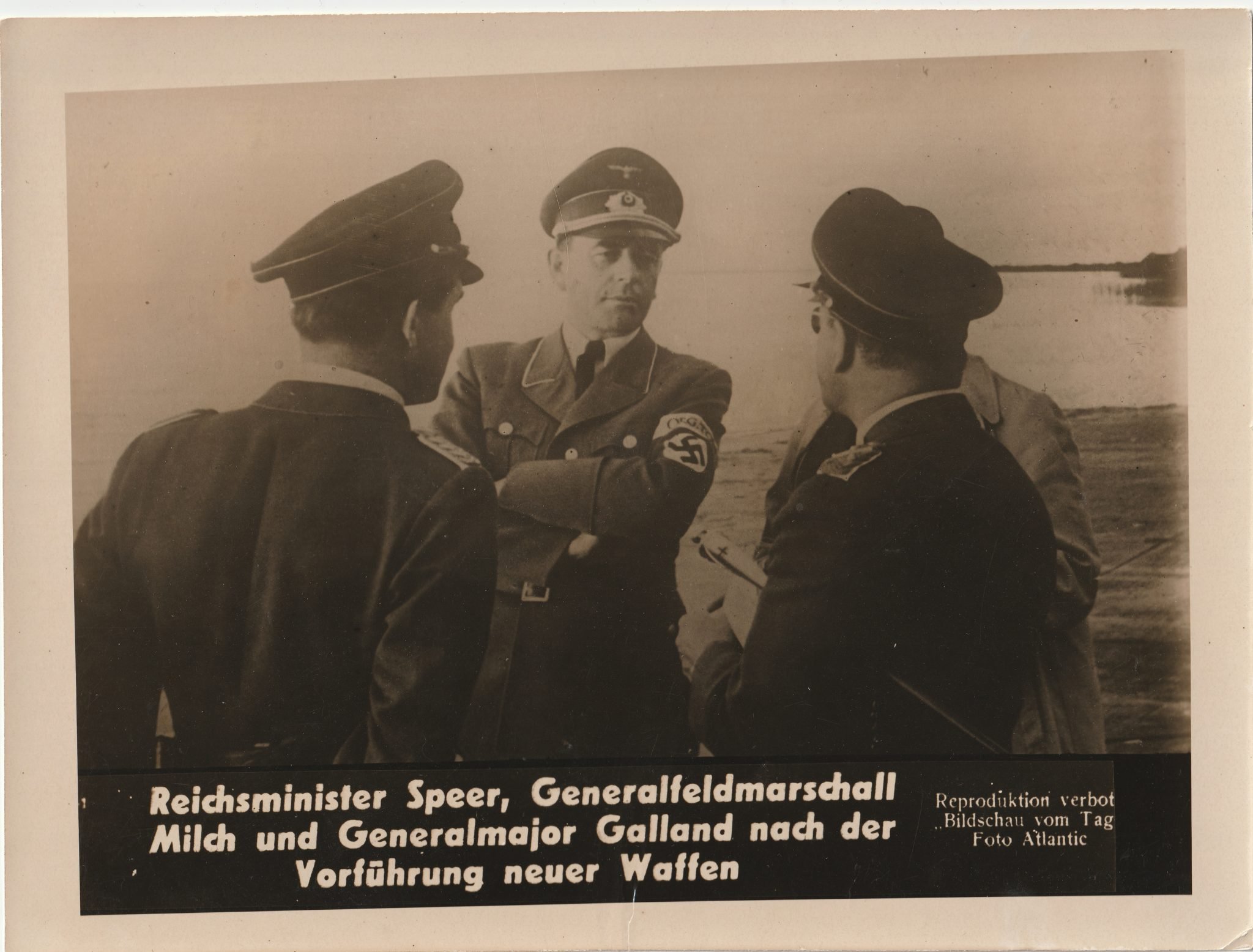 (Pressphoto) Reichminister Speer, Generalfeldmarschall Milch und GFeneralmajor Galland nach der Vorführung neuer Waffen (24x18cm).In good condition.