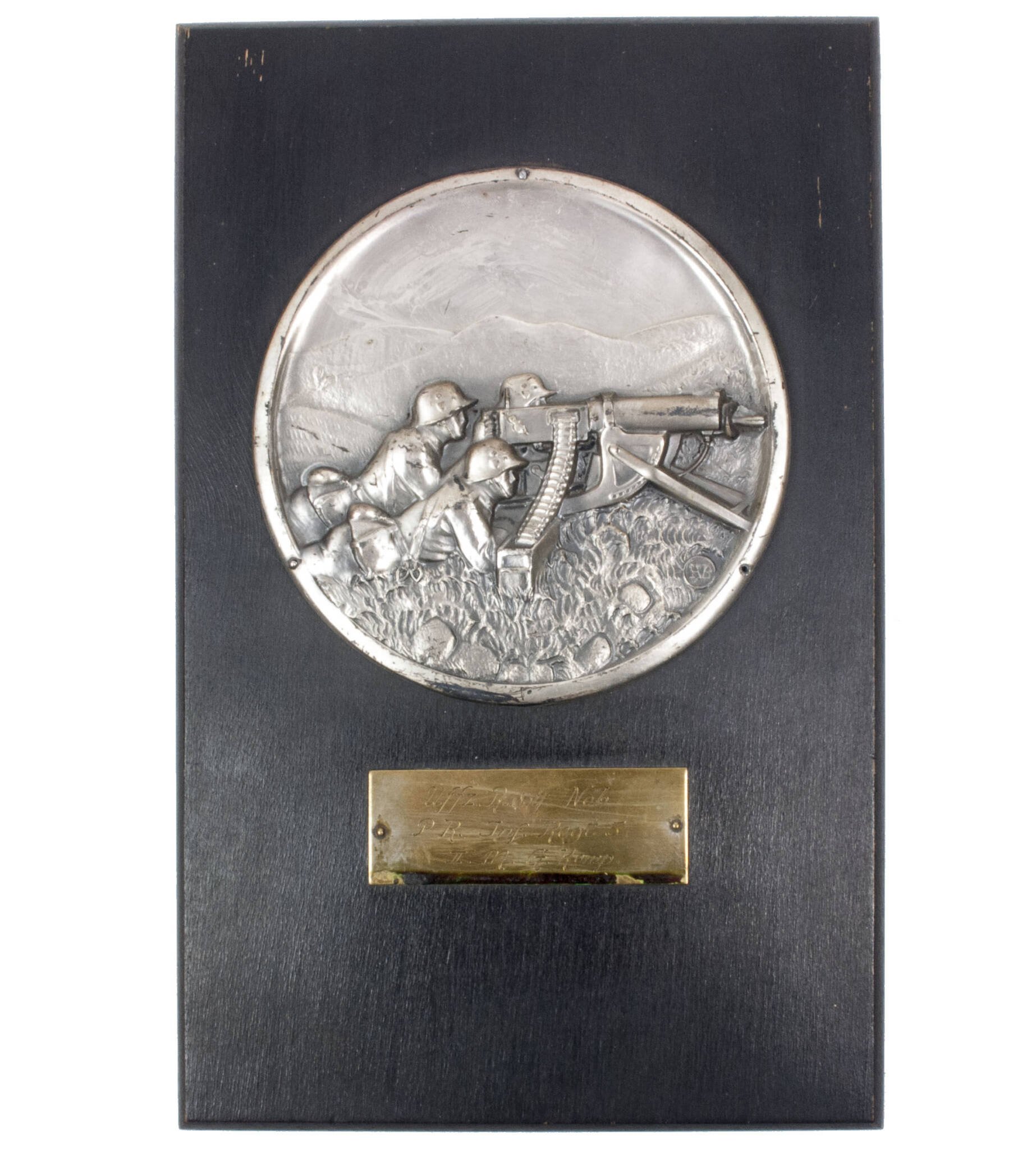 (Plaque) Plakette 'M.G. Kompanie':Uffizier Rudolf Nöh, PR. Inf. Regt. 5. II. M.G. Komp.The size is approximately 25 x 16 centimeters.One nail that holds the metal part in it's place missing, but still good affixed.In good condition.