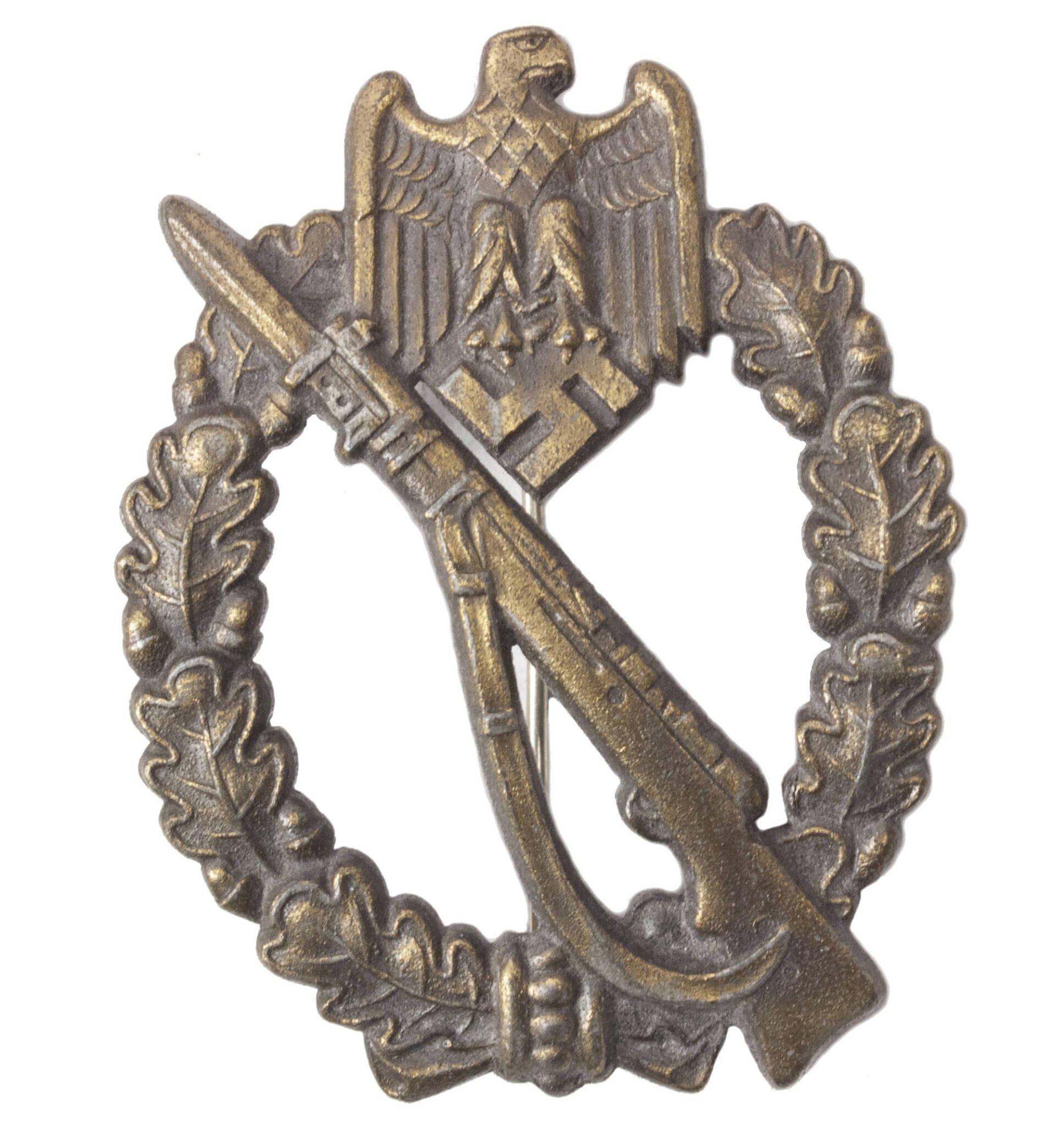 Infanterie Sturmabzeichen (ISA) / Infantry Assault Badge (IAB) in bronze.Maker marked on the back with 'JFS', which stands for maker Josef Feix & Söhne from Gablonz.Beautifull condition with lots of finish left, it would be hard to upgrade.