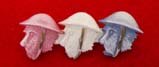 Just about 2 inches across. This pin is made of either plastic or celluloid material. It has three dogs heads wearing helmets in red, white and blue with a pinback.
