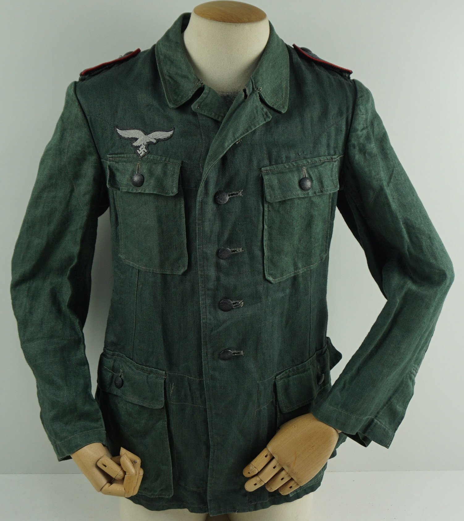 Luftwaffe Field Division model 1943 'Drillich' (HBT) Field Blouse (Feldbluse) Insignia orginal sewing! marked indicating 1943. EM's Flight Blouse (Fliegerbluse) as intended for an der Fielddi 'Fallschirmjäger' Nice original Luftwaffe field blouse in In very good condition!