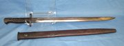 Original era manufacture. Sixteen inch blade with a three inch edge on the top of the blade tip. Wilkinson marked rather crudely on the ricasso with a manufacture date of 12'08. The blade shows a blue finish with period sharpening to the cutting edge. Dark finished wood grips with a crown proof on the left grip plate. Blue finished guard and pommel with the letters D and a broad arrow-2 on the guard obverse, drill? Mangrovite 42 marked Australian bayonet scabbard showing normal age and wear.