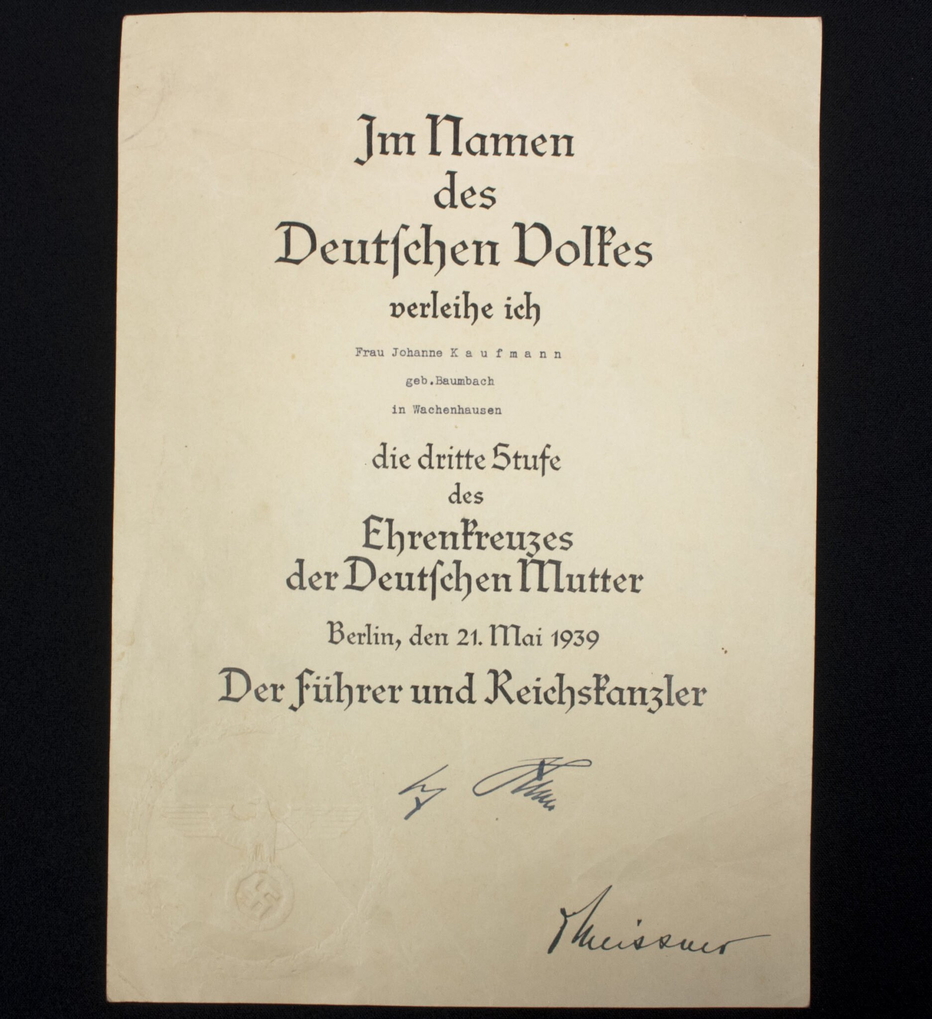 Mutterkreuz dritte Stufe Urkunde / Motherscross third class citation – 21. Mai 1939.in good condition.