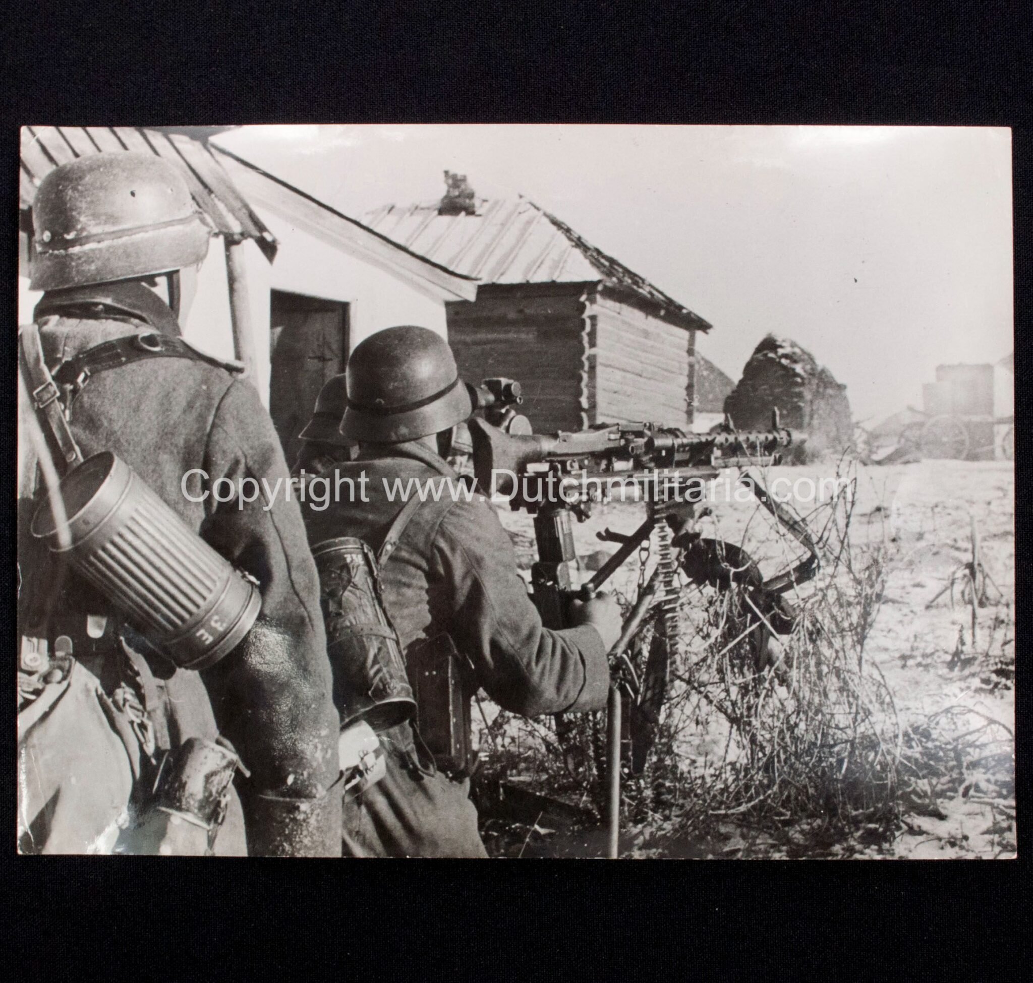 (Pressphoto) 'Deutsche Machinegewehre ziegeln eine Einbruchstelle der Sowjets ab'The size is approximately 22,5 x 16,5 centimeters. Large size.'Die Kämpfe im Osten kommen trotz Schnee und Kälte nicht zum Stillstand. Deutsche Machinegewehre ziegeln eine Einbruchstelle der Sowjets ab'. [Despite the snow and cold, the fighting in the east has not stopped. German machine guns target a Soviet break-in site].Deutscher Verlag Bilderzentrale.Collectorsstamp from former Brian L. Davis collection on the back.A rare and large original period pressphoto.