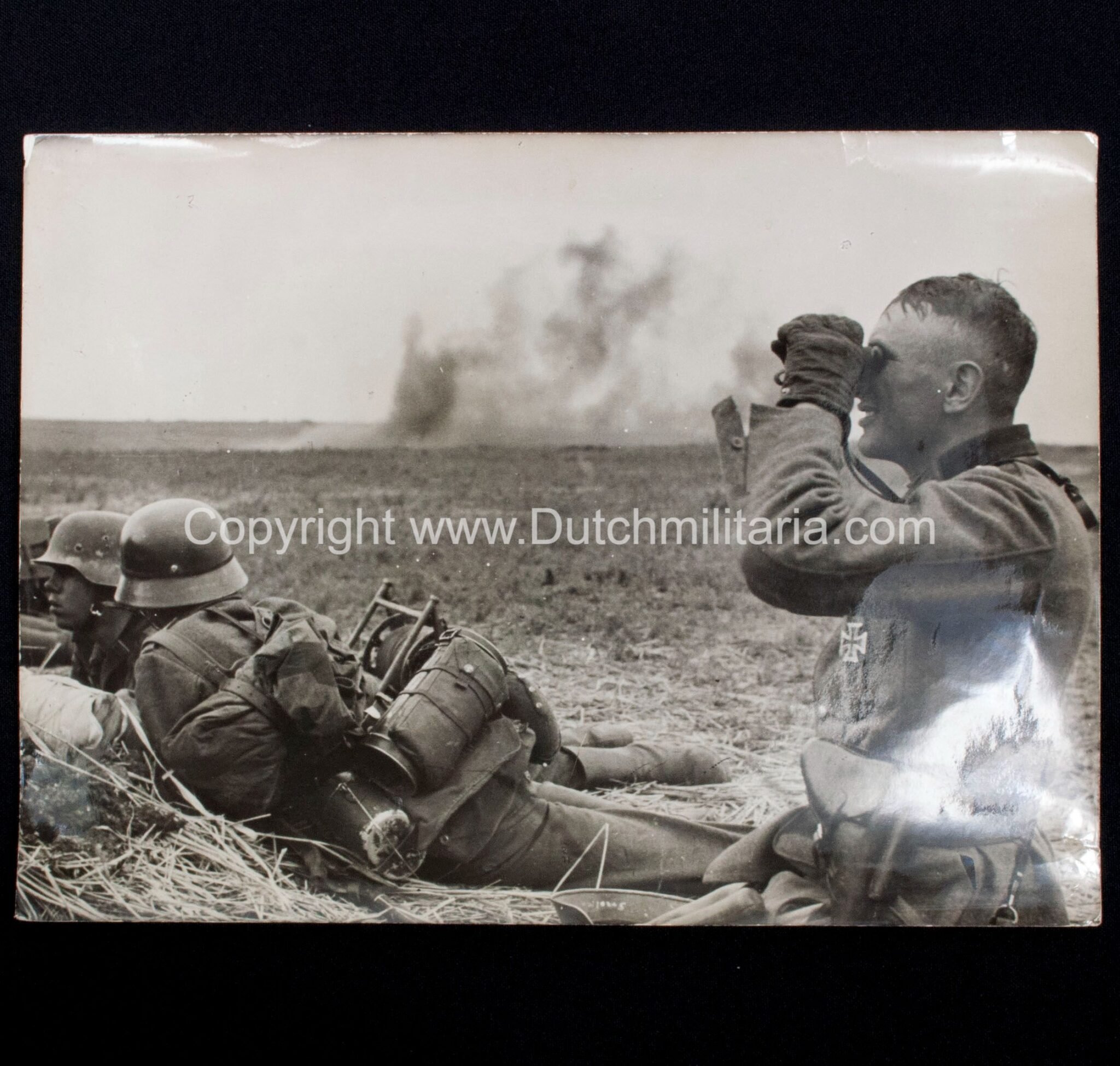(Pressphoto) 'Die Riesenschlacht von Charkow'.The size is approximately 24,5 x 18 centimeters. This is a a large size.'Die Riesenschlacht von Charkow. Offizier und Mann sind vom gleichen Vorwärts- und Siegesdrang beseelt. Der Hauptmann beobachtet hier aud der vordersten Kampflinie die verheerende Wirkung der deutschen Stukaangriffe, die die Bahn zum weiteren Vorgehen frei machen' [The giant battle of Kharkov. Officer and man are animated by the same urge to move forward and win. The captain observes from the front line the devastating effect of the German Stuka attacks, which clear the way for further action]Pk-Aufnahme, Kriegsberichter Hähle – AtlanticA very rare large size period orignal pressphoto.