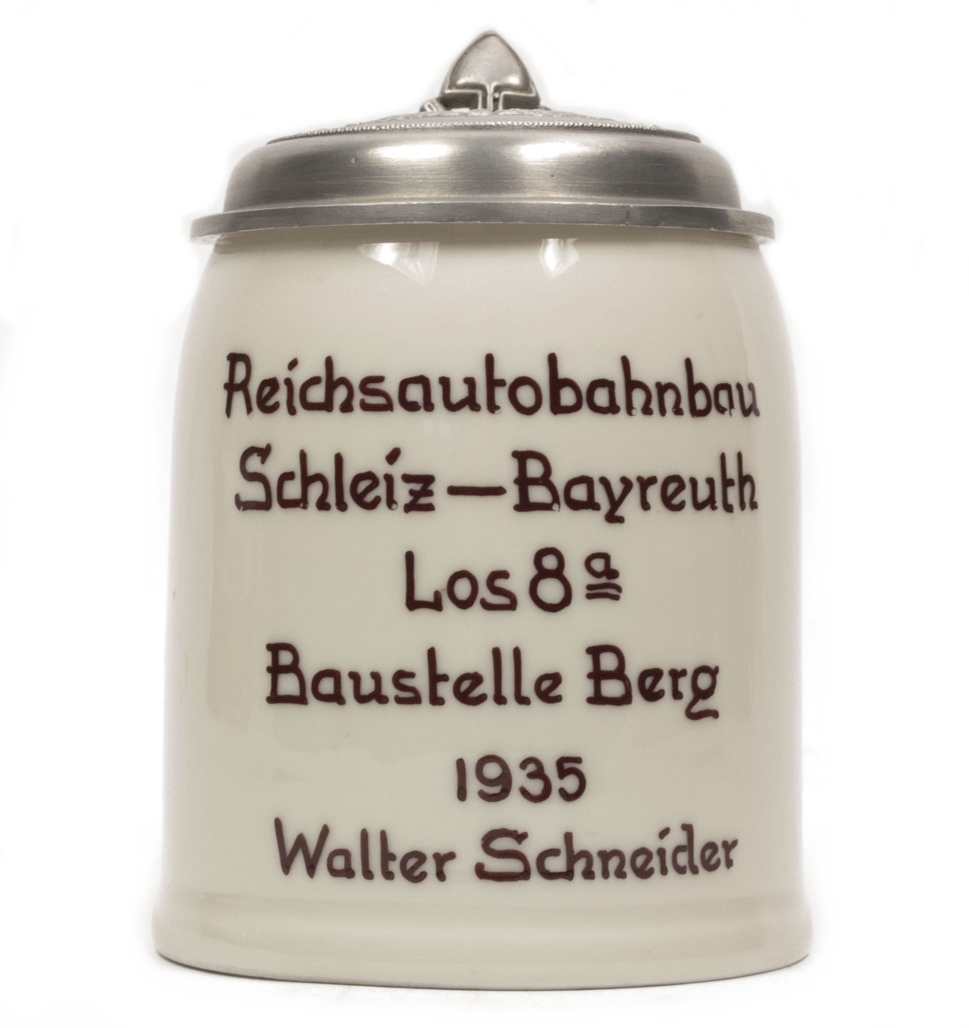 (Beerstein) Reichsarbeitsdienst (RAD) Reichsautobahn Schleiz – Bayreuth Los 8a. Baustelle Berg 1935 Walter Schneider.In excellent condition, only very minor chips at the edge.Stamped 'bavaria' on the bottom.A very very rare and beautifull beerstein of which probably no other exists. Guaranteed a great addition to any militaria, Autobahn or Beer collection!